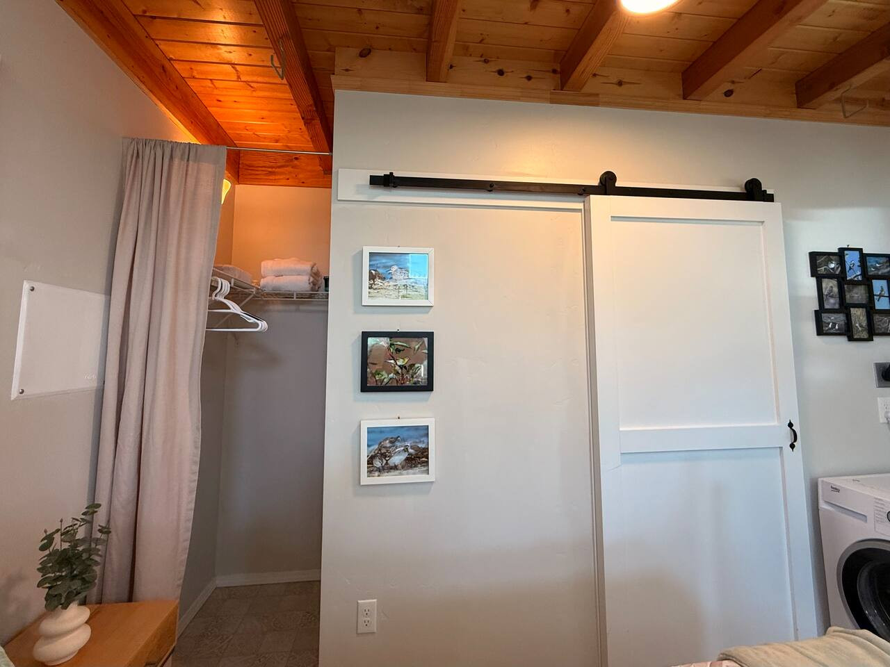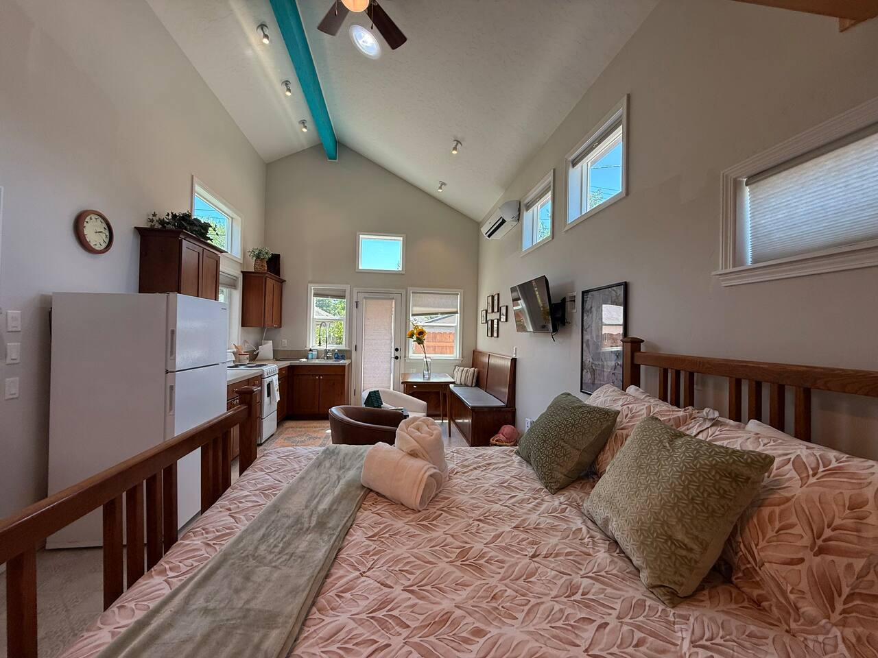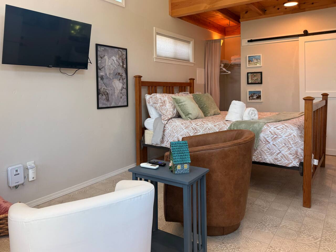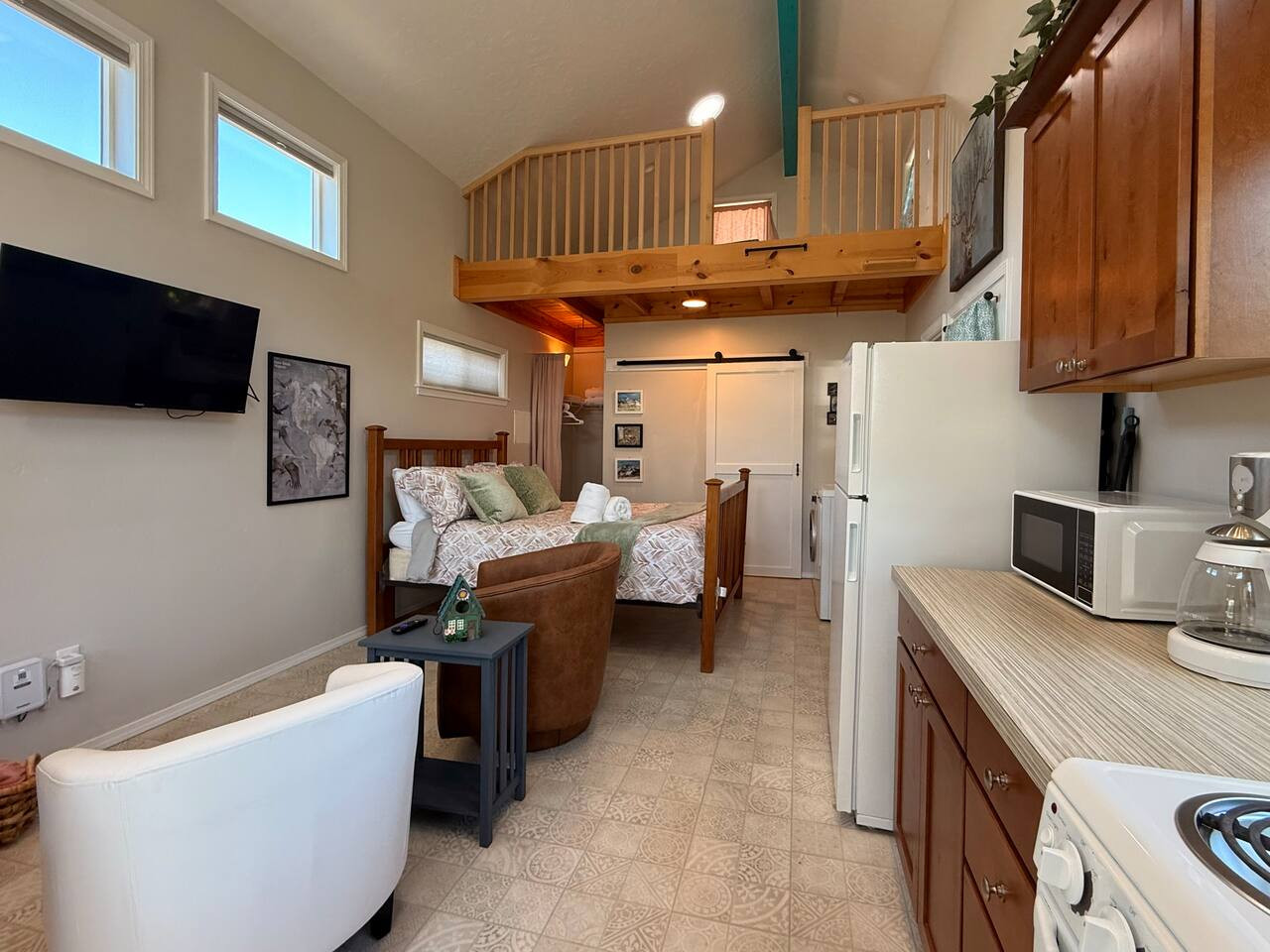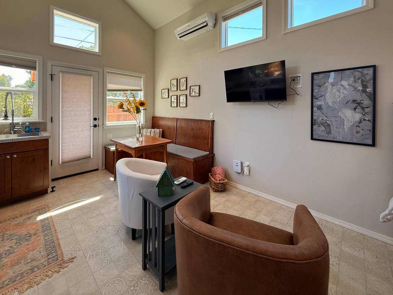 Welcome to Boise's Bird House — a cozy, light-filled tiny home tucked away in a lush green yard, just blocks from Whitewater Park, Quinn’s Pond, and the Boise Greenbelt. The cheerful yellow and orange exterior peeks out from behind vibrant plants and trees, inviting you into a warm and welcoming retreat. Inside, you’ll find soft green tones, earthy textures, and vaulted ceilings that make the space feel open, airy, and grounded in nature.