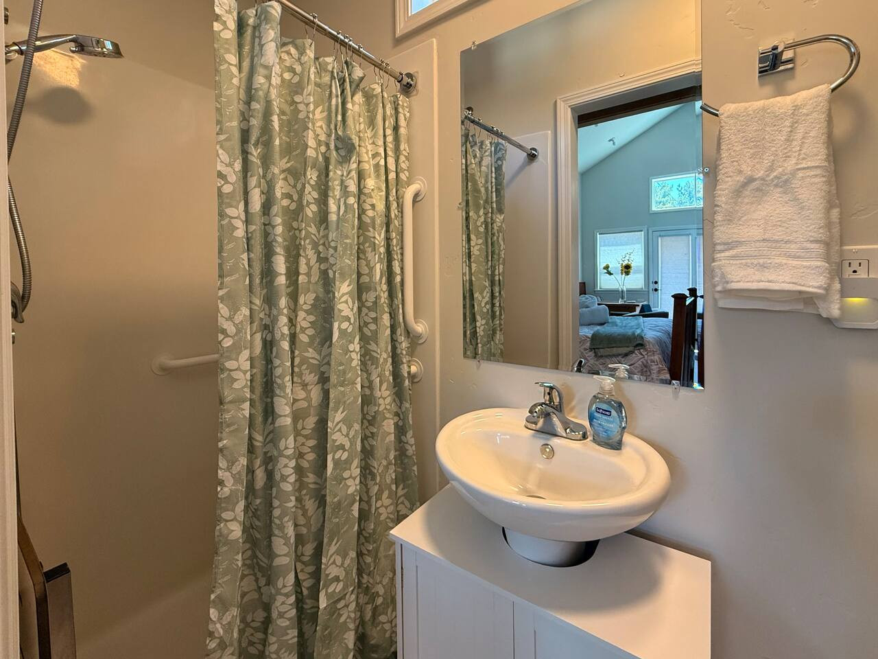 The bathroom is thoughtfully equipped with a walk-in shower, shower chair, and handrails for added accessibility. It is also stocked with shampoo, conditioner, body soap and a hair dryer so no need to pack extra items.