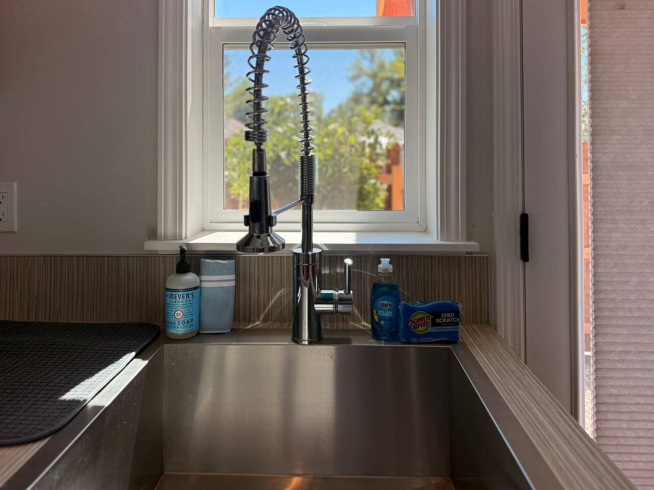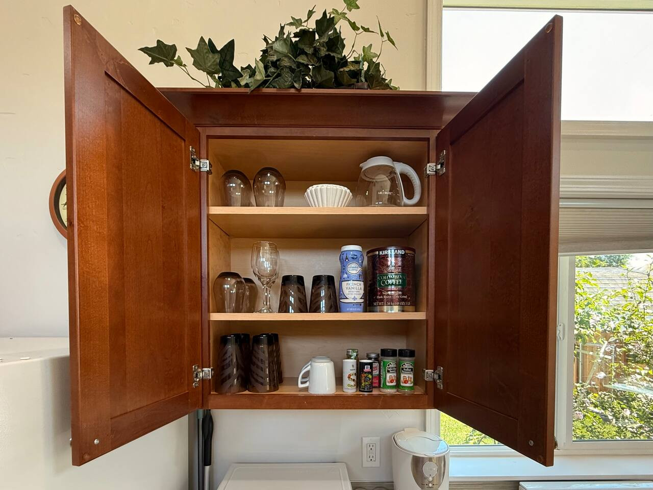 The brand-new kitchen features modern finishes, a deep basin sink with sprayer faucet and is fully stocked with everything you need to cook and bake— including coffee to jumpstart your mornings.