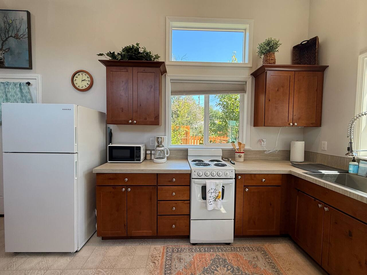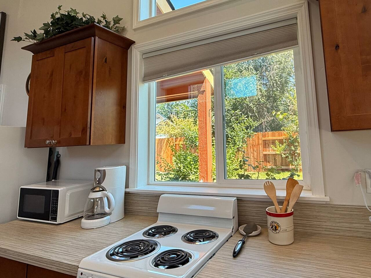 Just outside, a covered patio with two chairs offers the perfect spot for morning coffee or evening unwinding in the fresh Idaho air. Note that the yard is not usable for this unit as it belongs to the tenants of the main house. The main house is not connected to this unit. The Bird Nest is its own private dwelling with a small, covered patio you can use for your enjoyment outside.