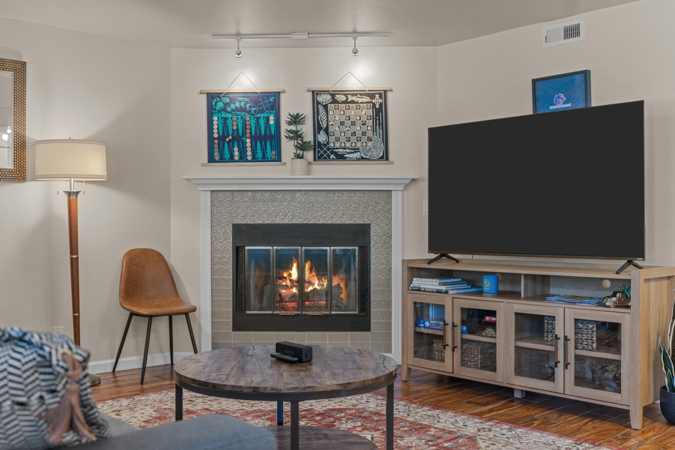 As you enter, you’re greeted by warm wood tones, charming décor, and an open-concept living space designed for comfort. The living room invites you to sink into plush seating, curl up by the fireplace, and enjoy a movie night on the 55-inch Smart TV. When it's time to turn in, the queen-size sofa sleeper makes for a cozy additional sleeping space.