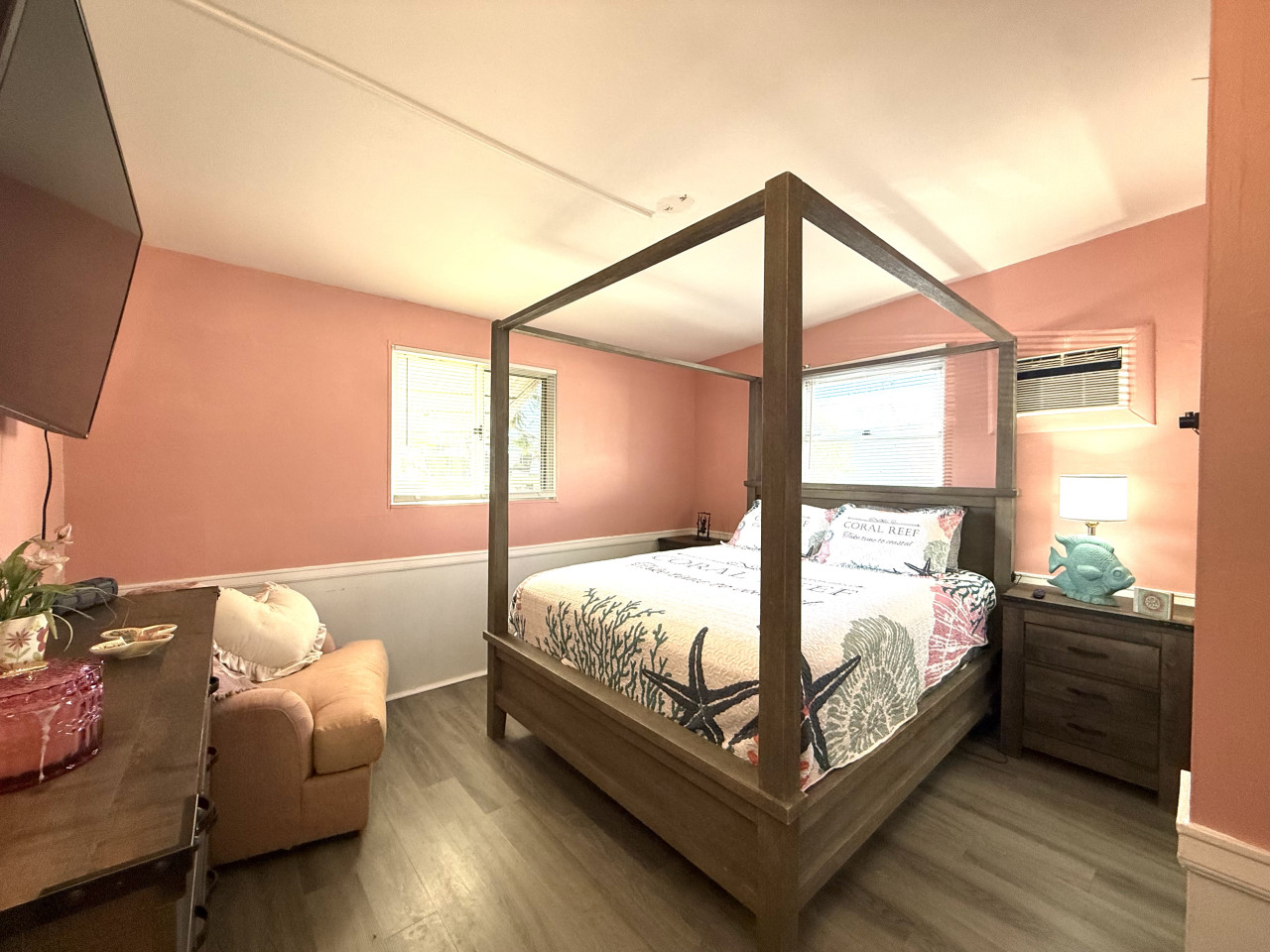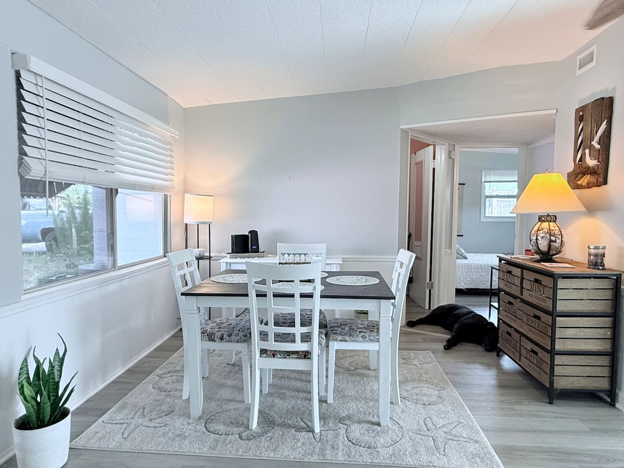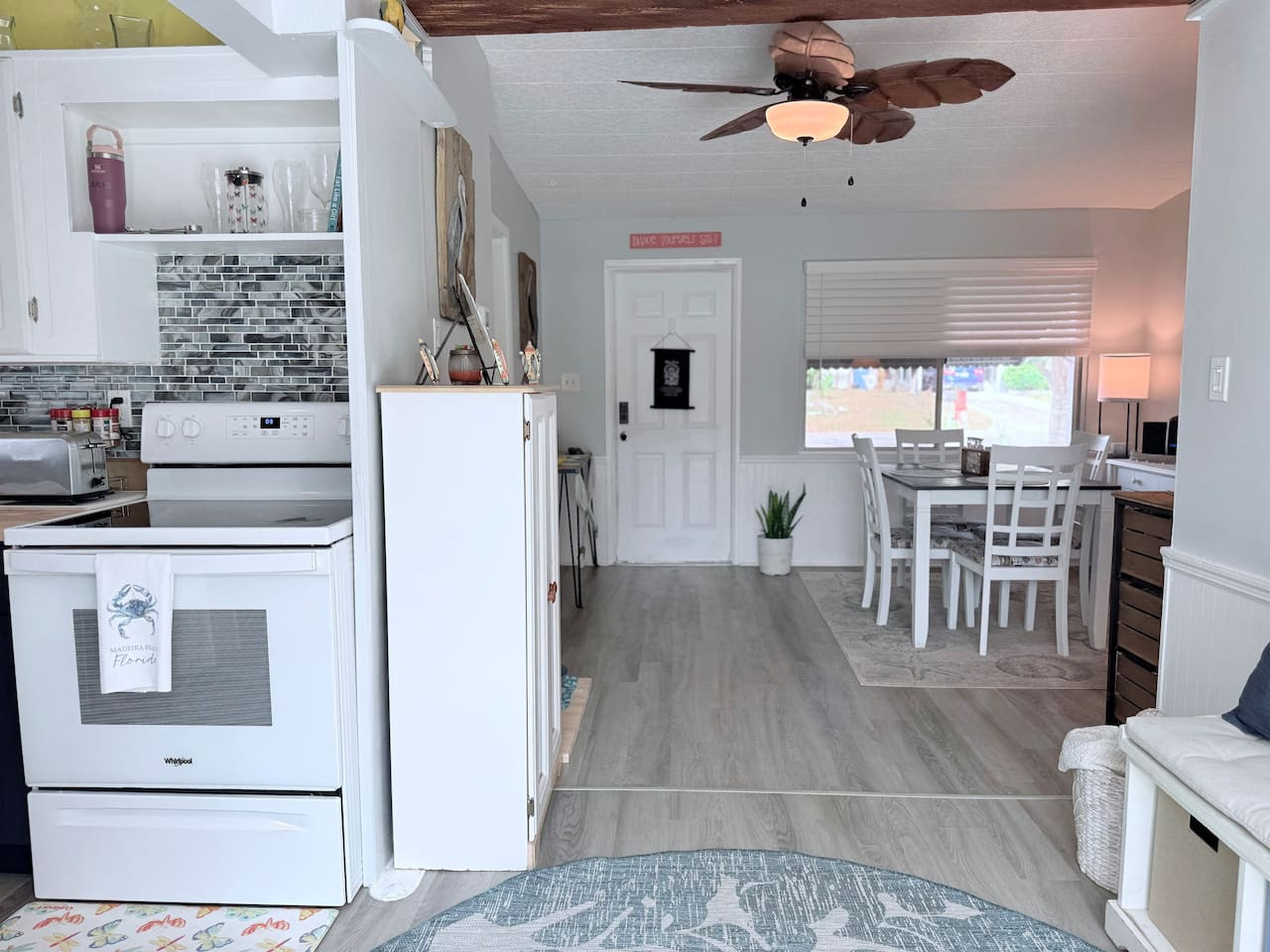 The interior of the property exudes a warm and inviting ambiance, with a coastal décor that combines functionality with style. Natural light floods through the windows, enhancing the airy feel of the space. You'll appreciate the modern appliances in the newly remodeled kitchen, making meal preparation a breeze. The living area is ideal for lounging, featuring comfortable seating and entertainment options with a large screen Smart TV and seating for 8.