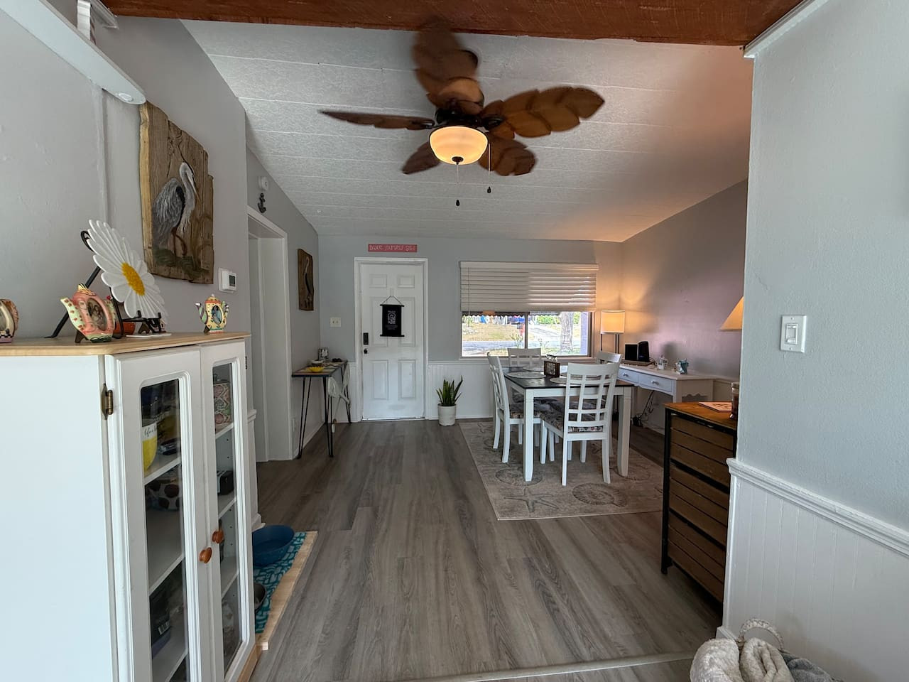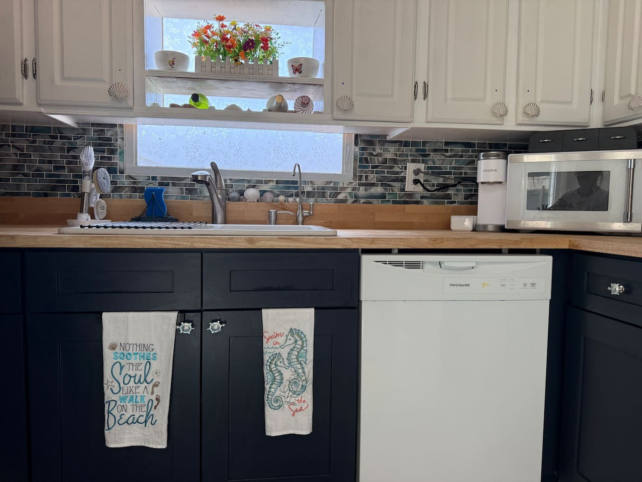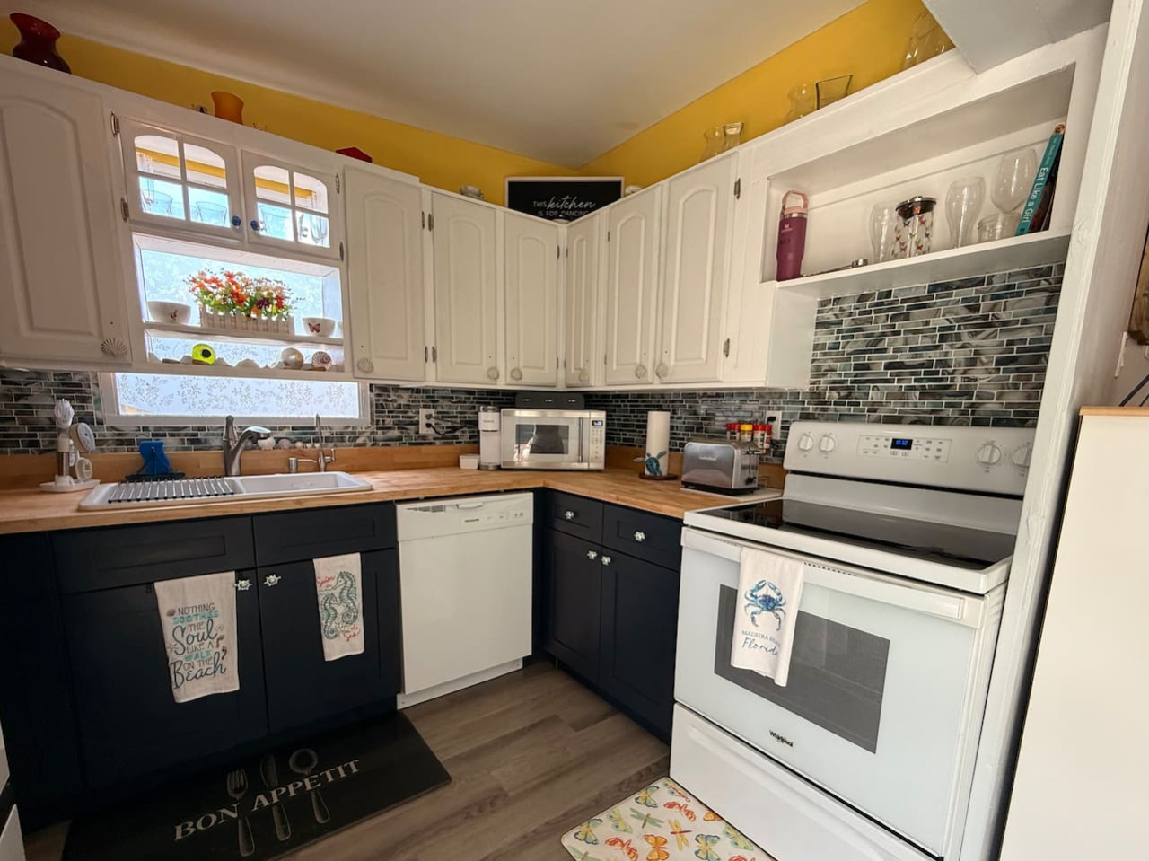 The interior of the property exudes a warm and inviting ambiance, with a coastal décor that combines functionality with style. Natural light floods through the windows, enhancing the airy feel of the space. You'll appreciate the modern appliances in the newly remodeled kitchen, making meal preparation a breeze. The living area is ideal for lounging, featuring comfortable seating and entertainment options with a large screen Smart TV and seating for 8.