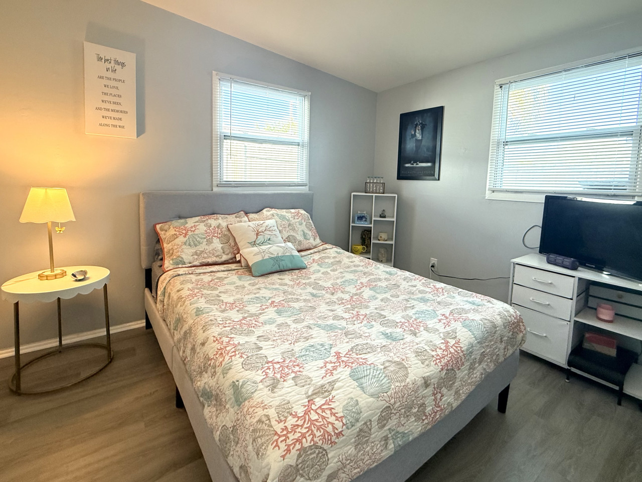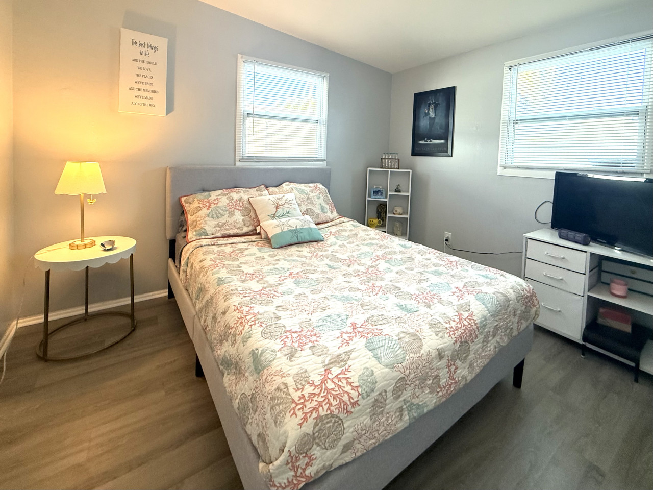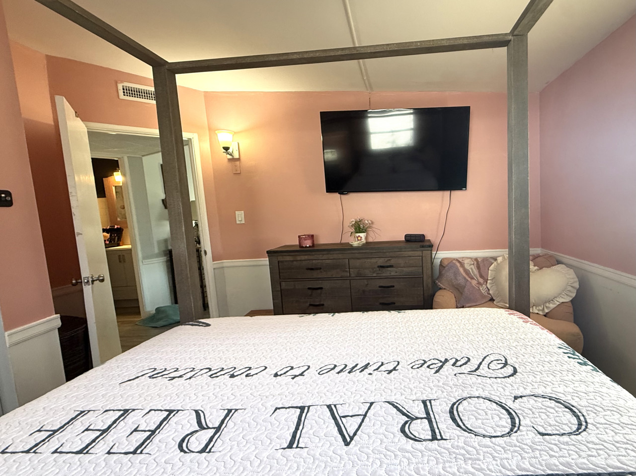 The rental features two cozy bedrooms, designed to cater to your comfort and relaxation needs. Each room is furnished with a queen bed, plush bedding and ample closet space, making it perfect for couples or families. The master bedroom boasts a queen size canopy bed while the second bedroom has a full remote workstation including a standup desk, monitor and printer for your use.