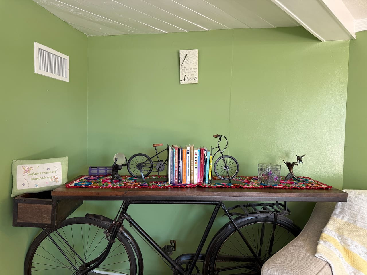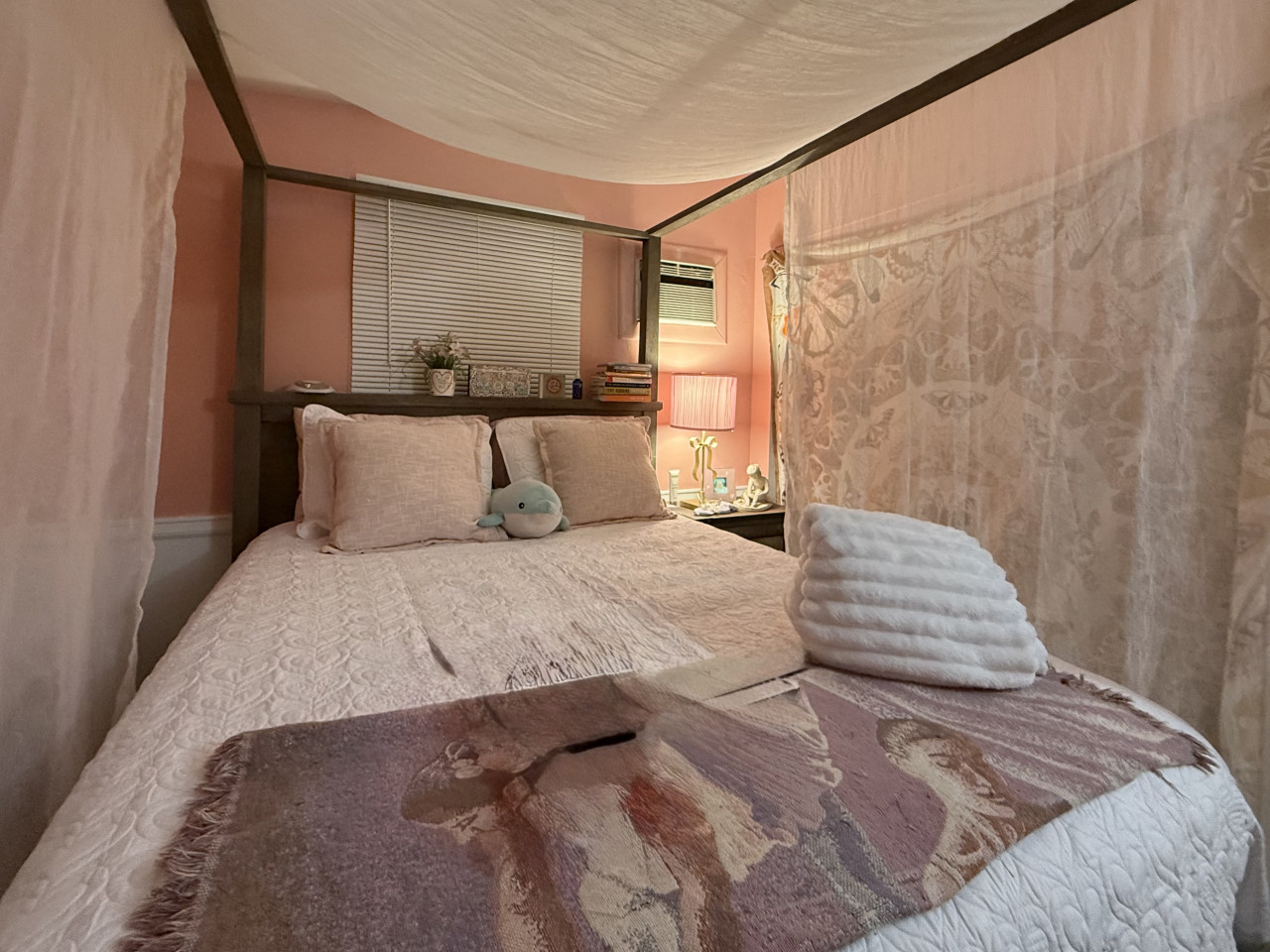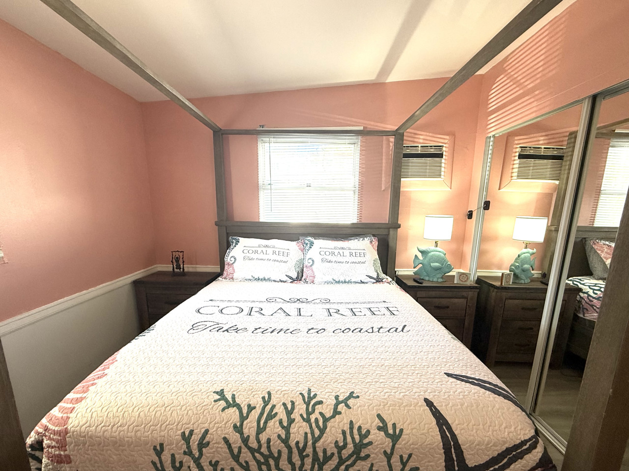 The rental features two cozy bedrooms, designed to cater to your comfort and relaxation needs. Each room is furnished with a queen bed, plush bedding and ample closet space, making it perfect for couples or families. The master bedroom boasts a queen size canopy bed while the second bedroom has a full remote workstation including a standup desk, monitor and printer for your use.