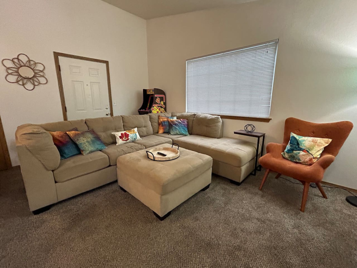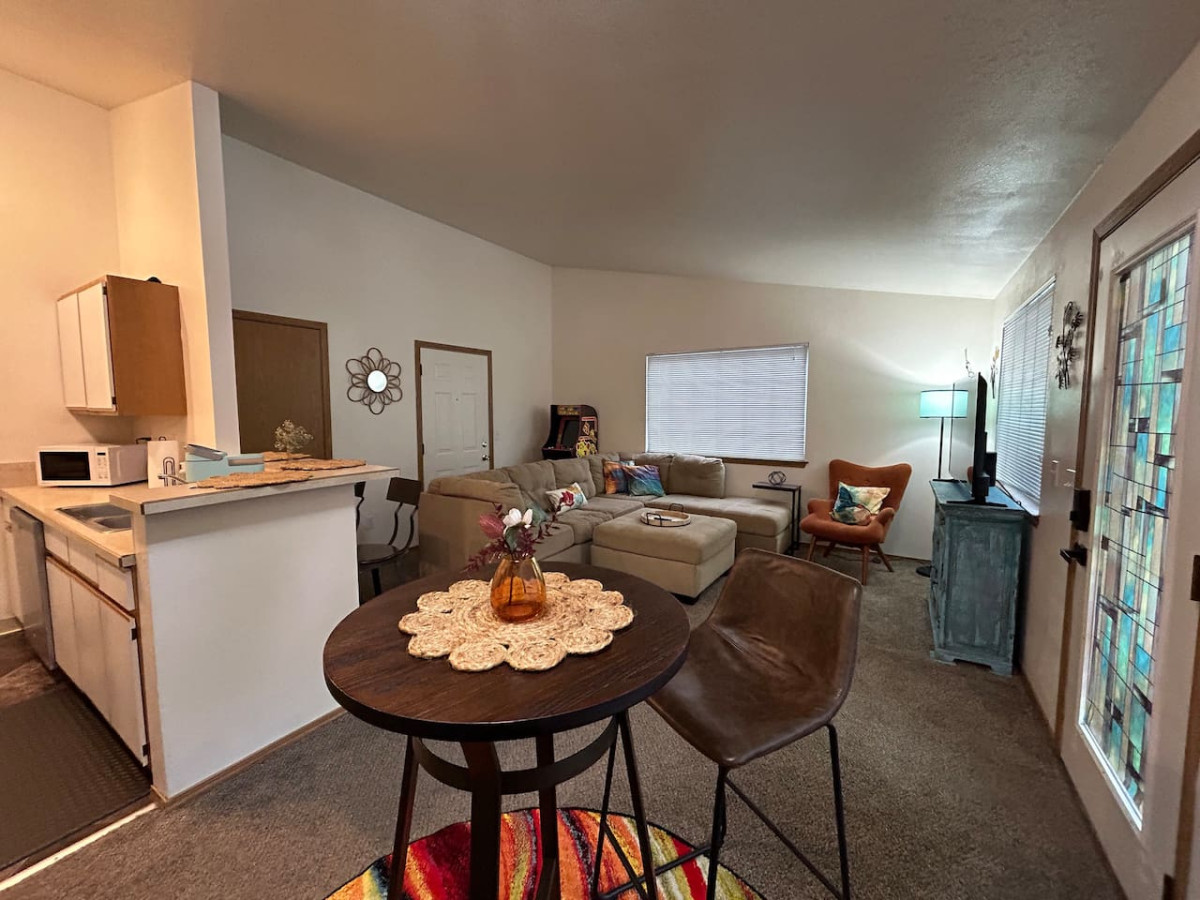 Discover the perfect blend of nostalgia and modern comfort in our 2-bedroom, 1.5-bath cozy home, where every detail is designed to make your stay unforgettable. Indulge your nostalgic side with our Ms. Pac-Man arcade machine complete with 15 different arcade games, cook in our retro kitchen and unwind in our plush sofa and beds adorned with cool hues that create a tranquil atmosphere. Two queen beds, two private baths and two parking spots available.