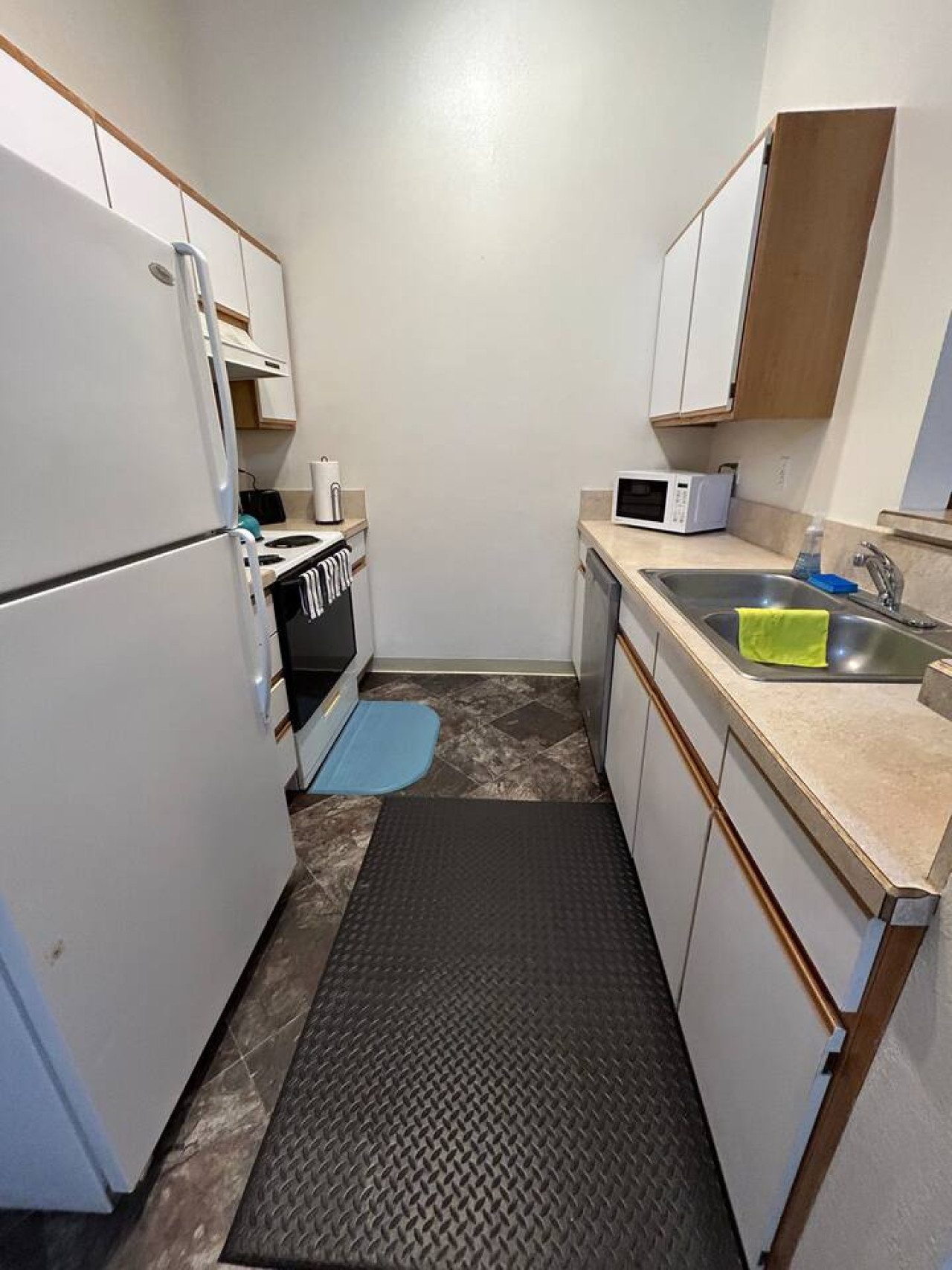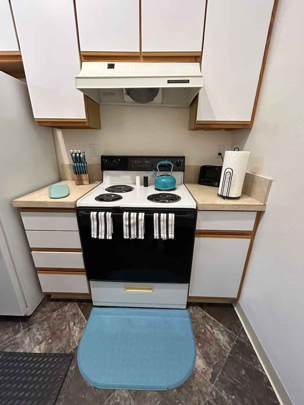 The warm ambiance of cool colors creates an inviting and relaxing atmosphere throughout the space. Feel right at home as you enjoy the unique blend of retro charm and modern comfort.