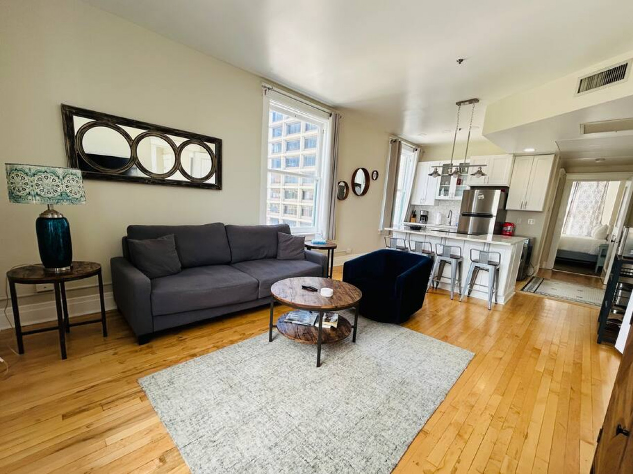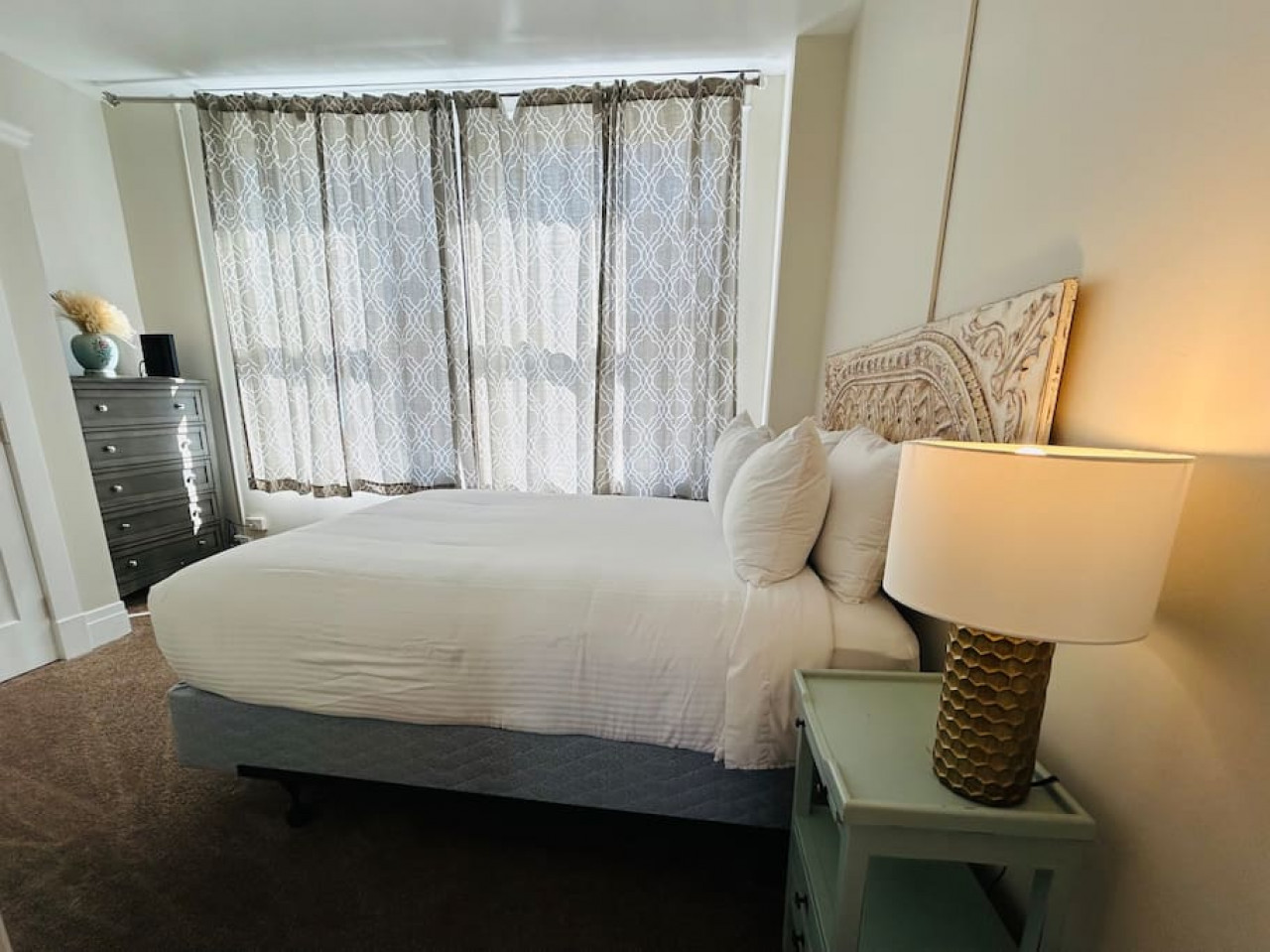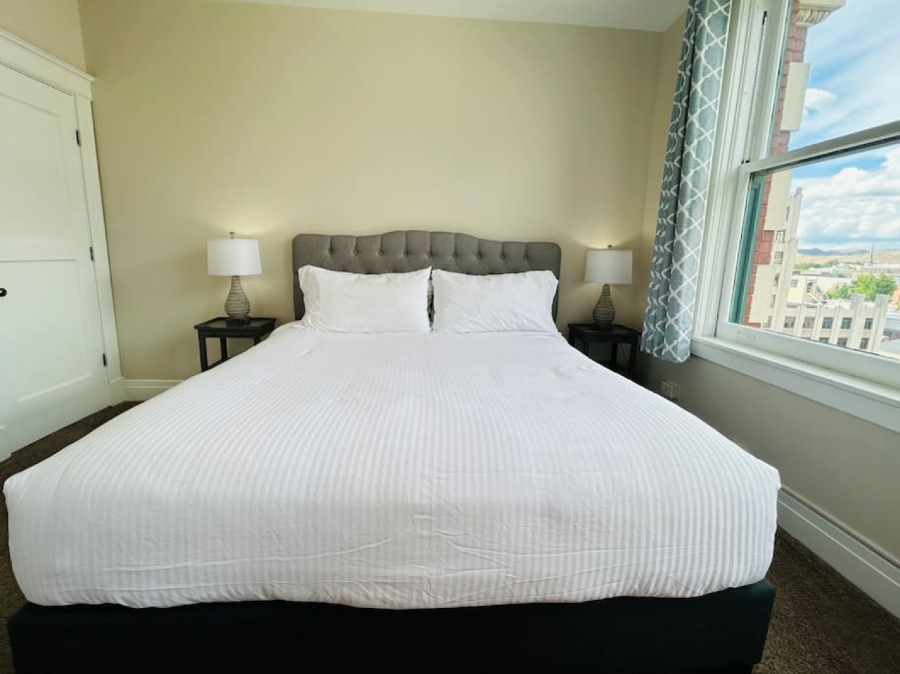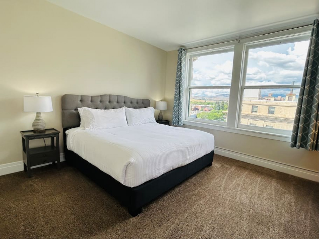 The Capitol building is visible from the master bedroom and living room. The master bedroom has a luxurious king size bed with 8 ft windows overlooking Boise's State Capitol and the foothills in the backdrop. The adjoining master bathroom has an adjustable heated toilet seat, and an oversized curved rain shower head in a glass shower. All amenities are included: shampoo, conditioner, body wash and blow dryer.