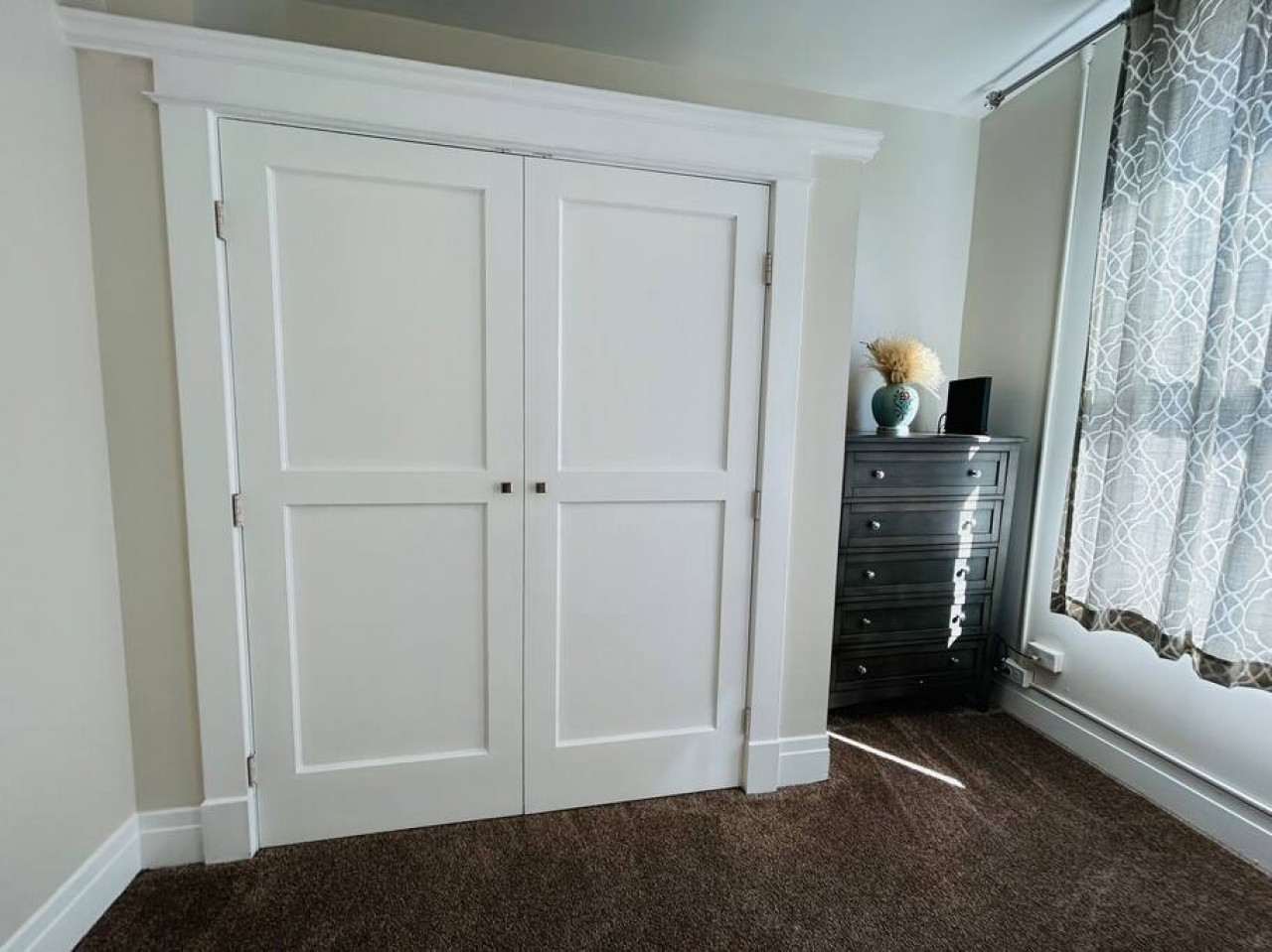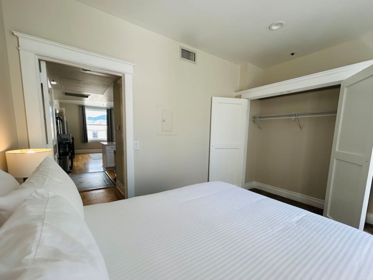 The second bedroom has a view of downtown local artist art paintings on the wall of a 30 ft. building and features a queen bed with giant double door closets.
