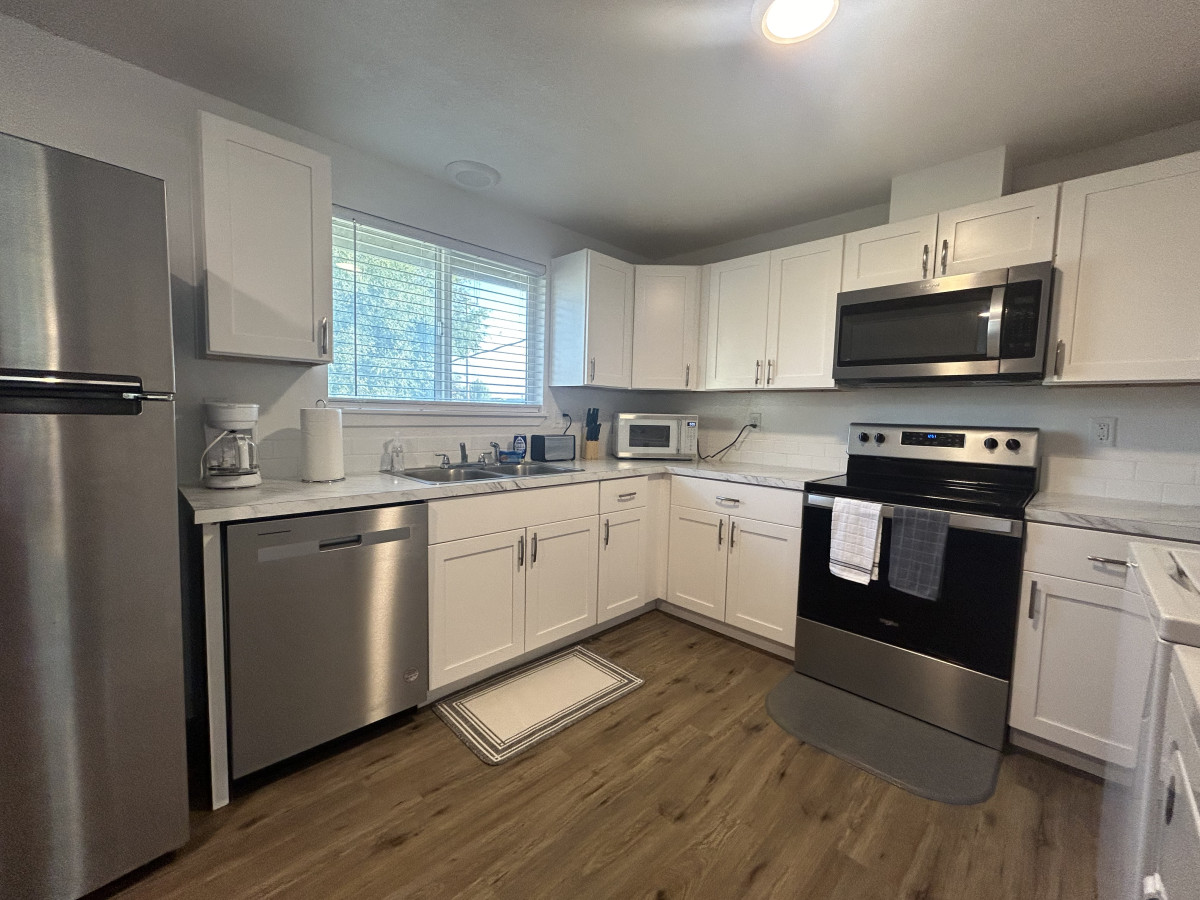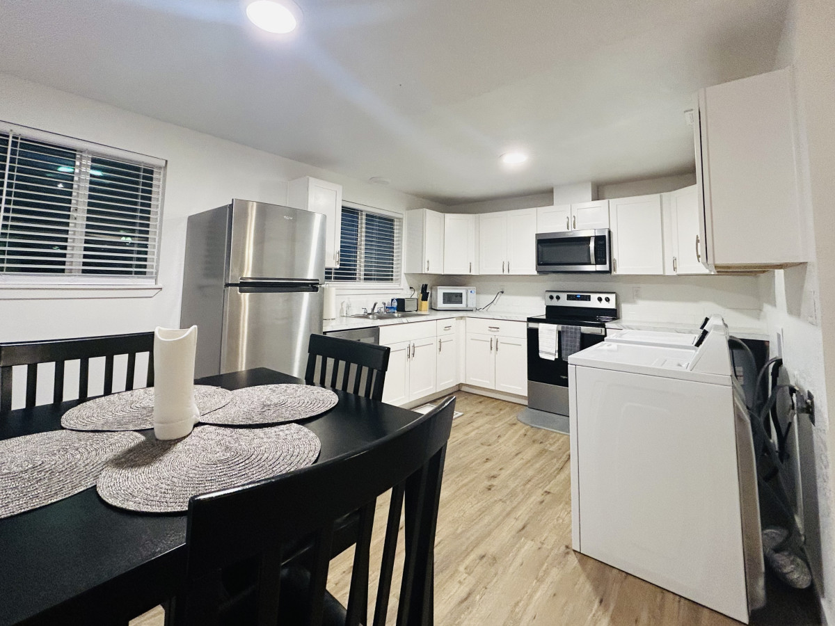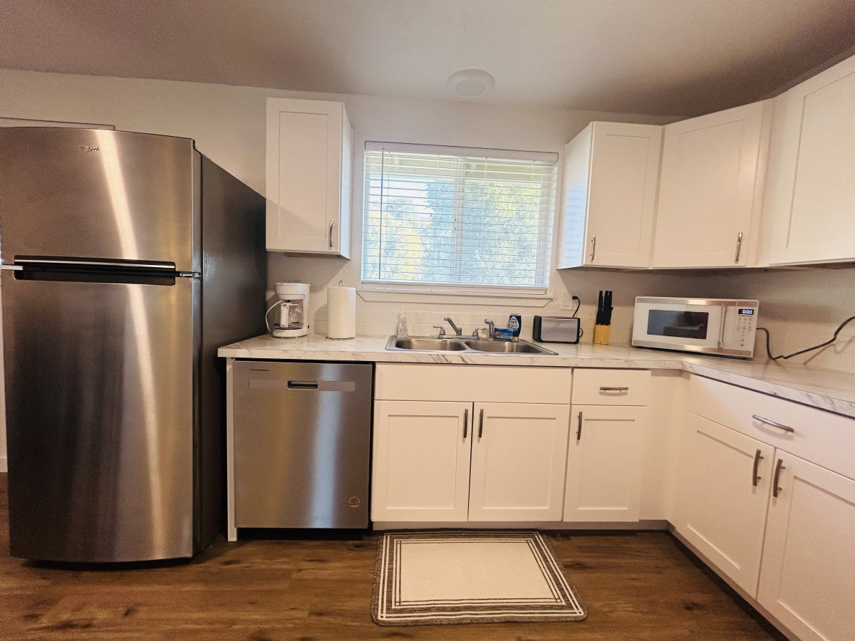 The newly renovated kitchen features stainless steel appliances, clean white cabinetry, and a full stock of essentials, so you’ll have everything you need to cook up a hearty meal or enjoy a cup of coffee in the morning. The bathroom is fully equipped with soaps, a hair dryer, and fluffy towels to ensure your stay is comfortable and worry-free.