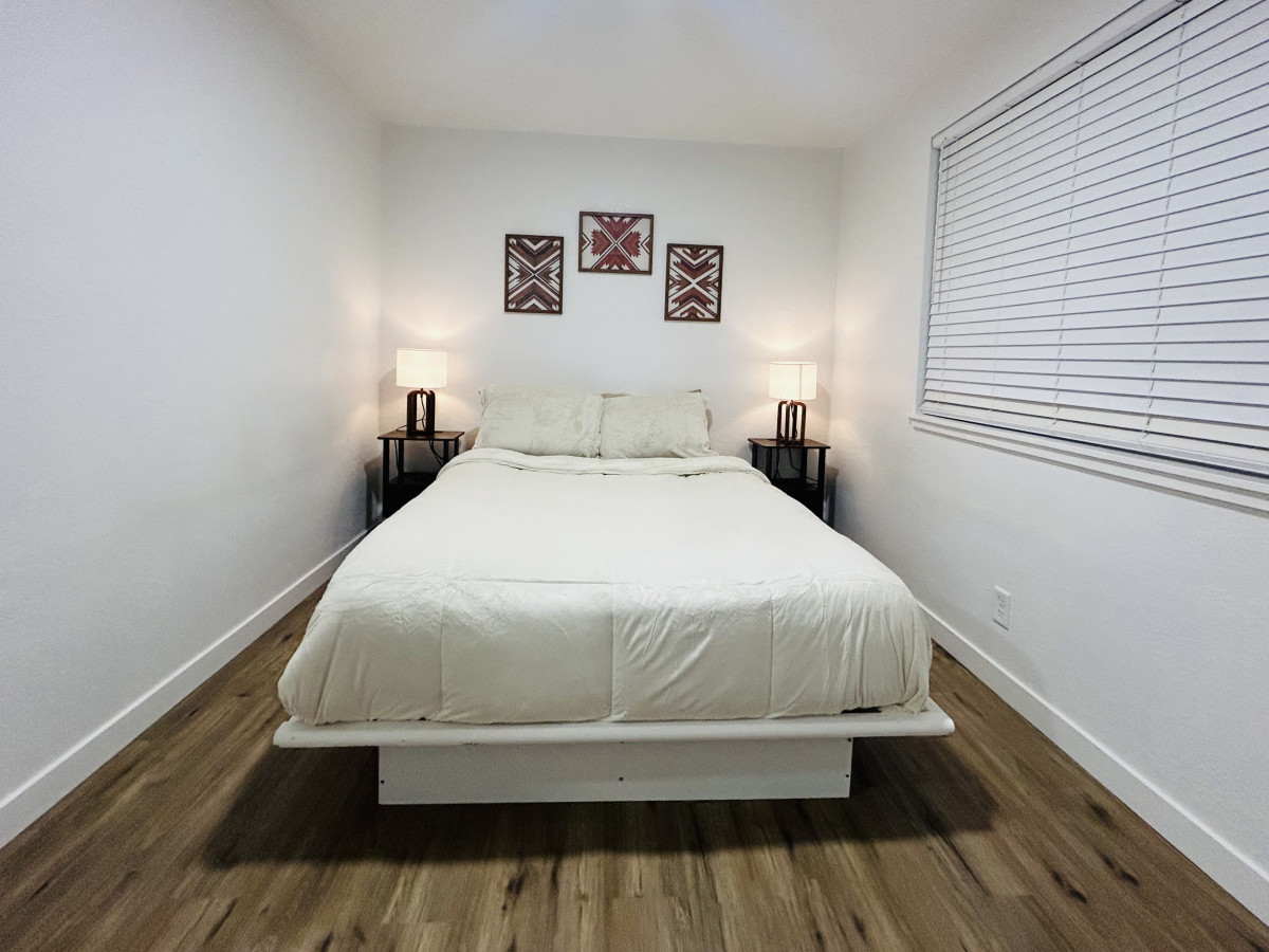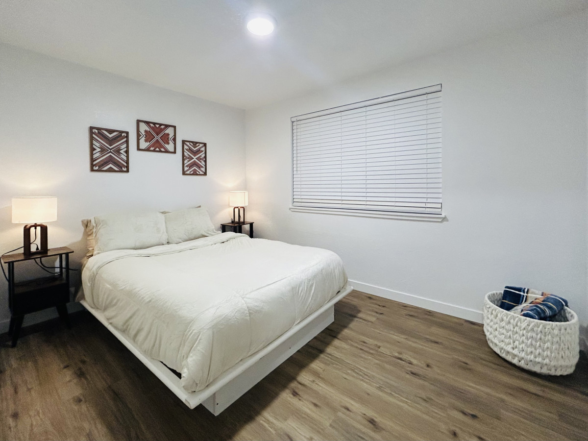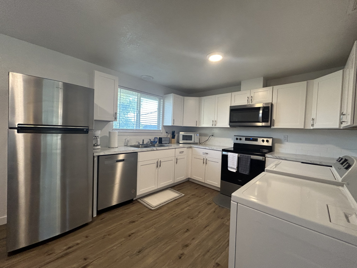 The newly renovated kitchen features stainless steel appliances, clean white cabinetry, and a full stock of essentials, so you’ll have everything you need to cook up a hearty meal or enjoy a cup of coffee in the morning. The bathroom is fully equipped with soaps, a hair dryer, and fluffy towels to ensure your stay is comfortable and worry-free.