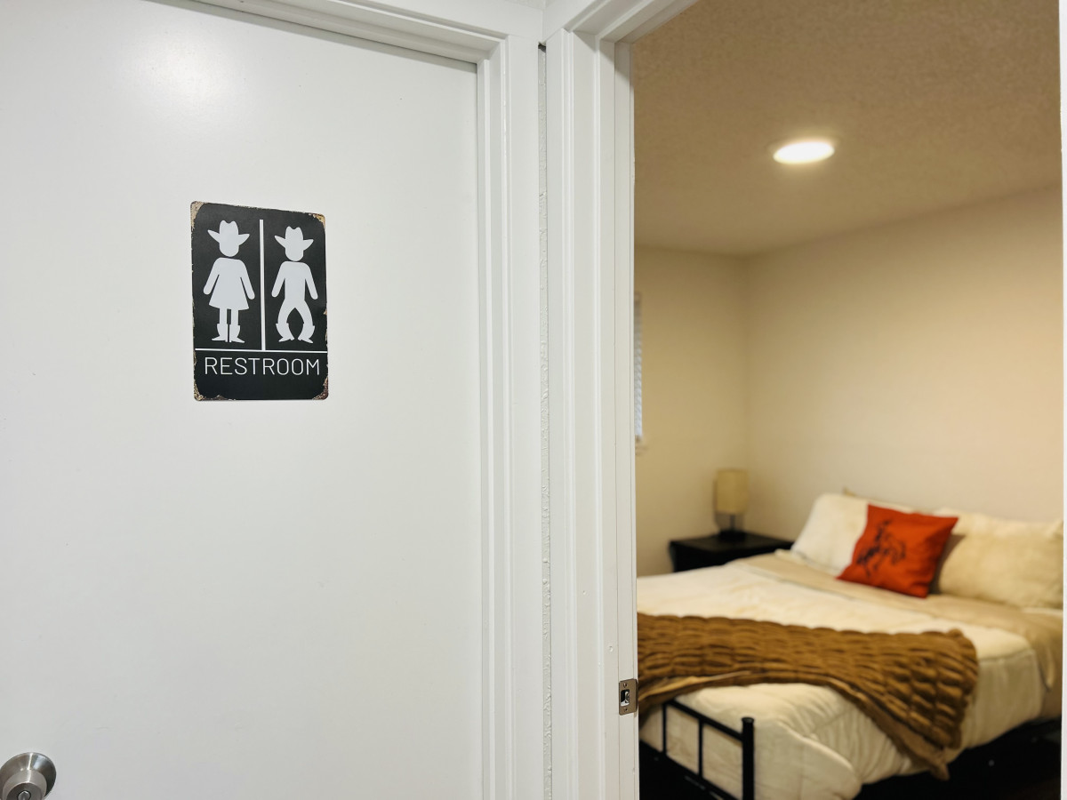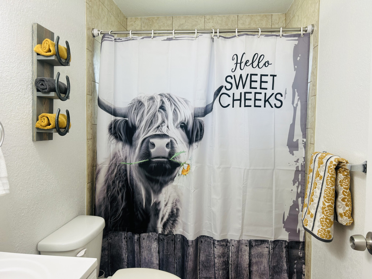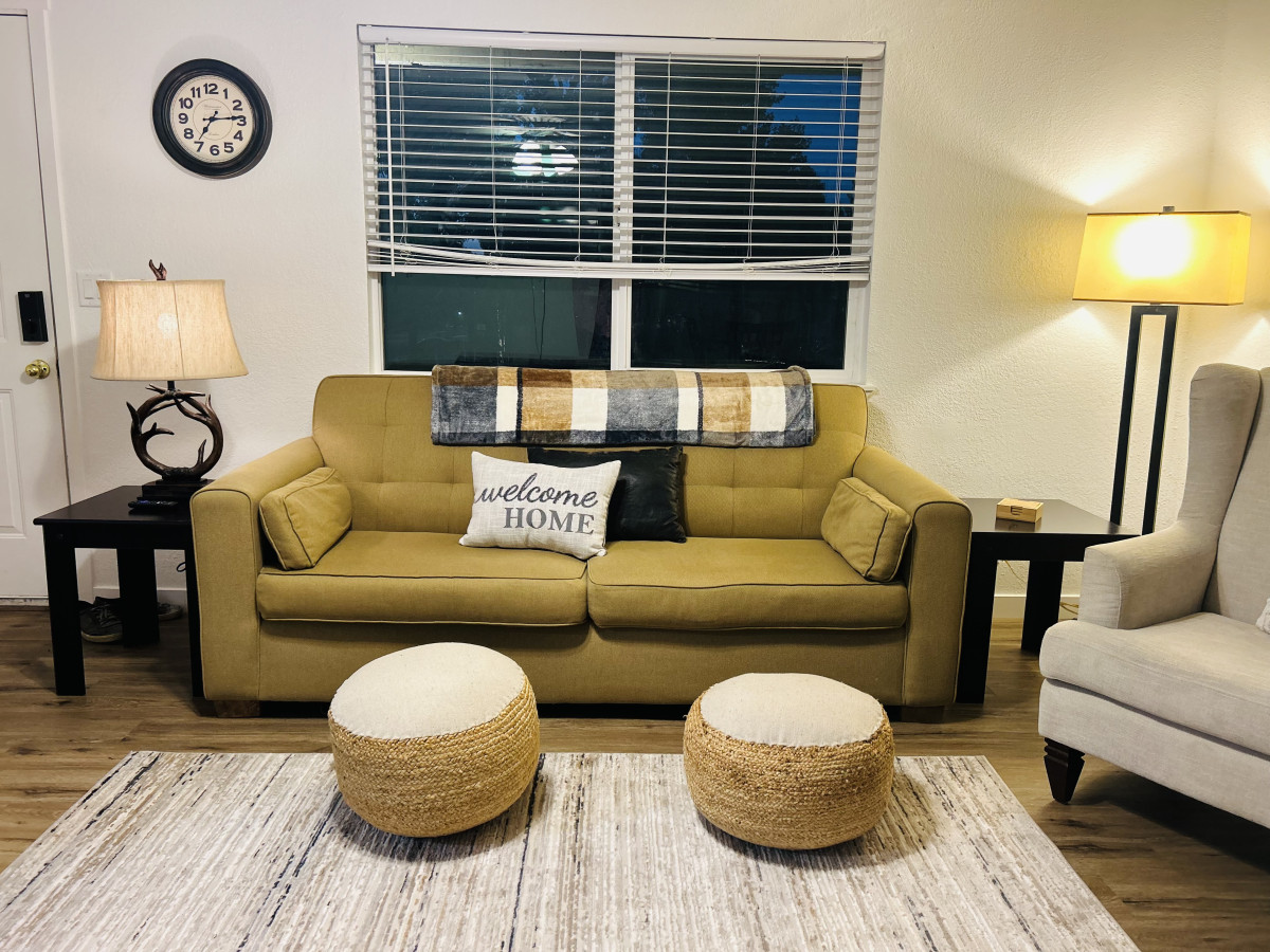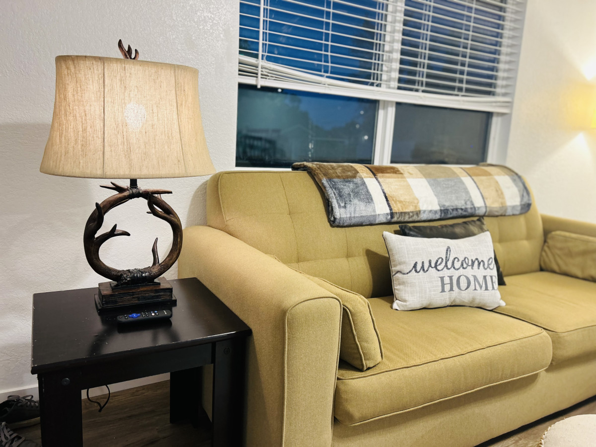 Step inside and kick back and relax in the cozy living room, where a brand-new, plush couch invites you to unwind after a day of adventure. Styled with Western-inspired accents, this comfortable space is perfect for watching a movie on the smart TV or gathering around for game night. The rustic touches give it a warm, inviting feel, making it an ideal spot to relax and recharge.