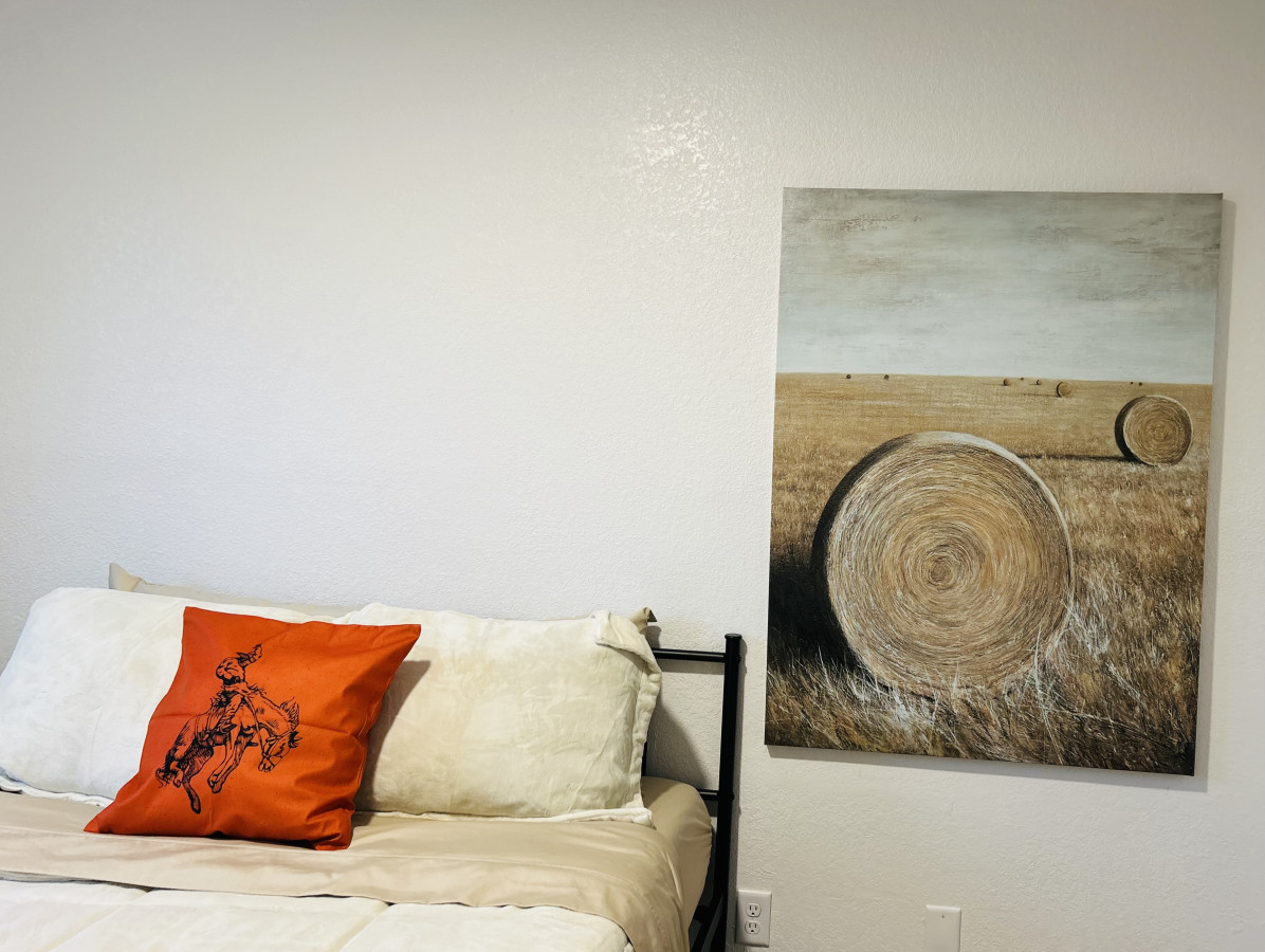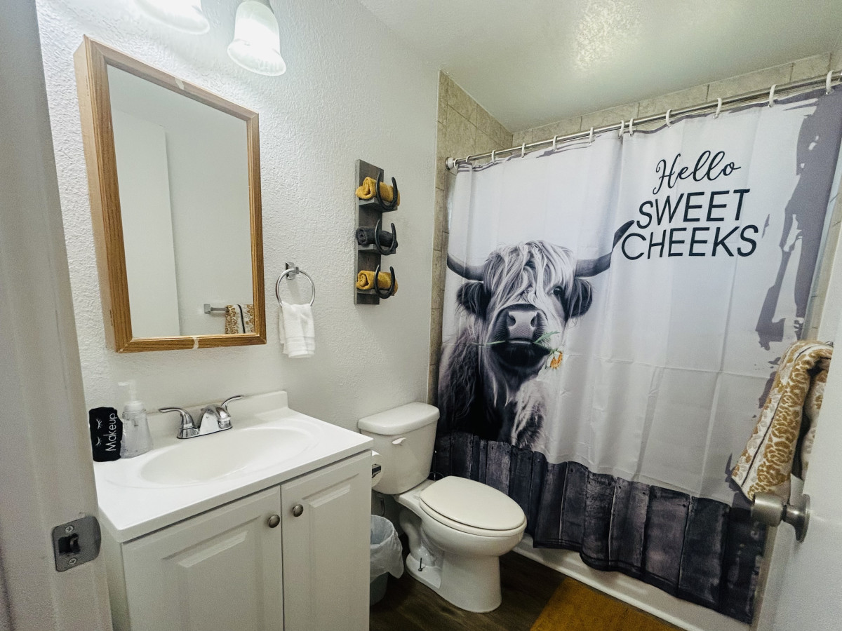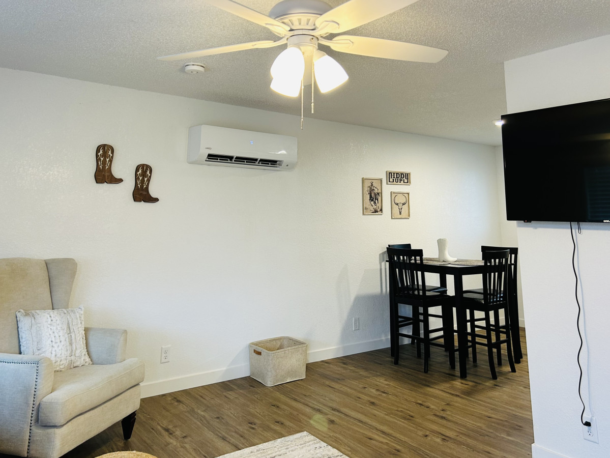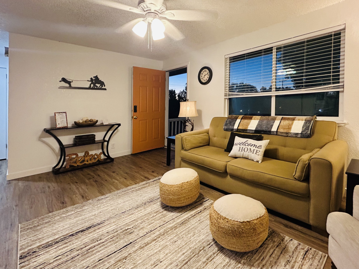 Step inside and kick back and relax in the cozy living room, where a brand-new, plush couch invites you to unwind after a day of adventure. Styled with Western-inspired accents, this comfortable space is perfect for watching a movie on the smart TV or gathering around for game night. The rustic touches give it a warm, inviting feel, making it an ideal spot to relax and recharge.