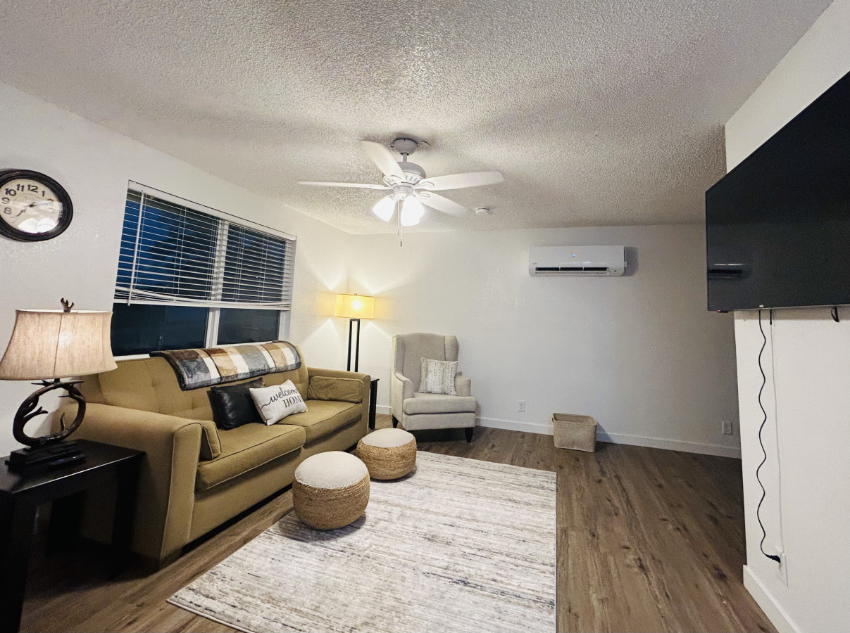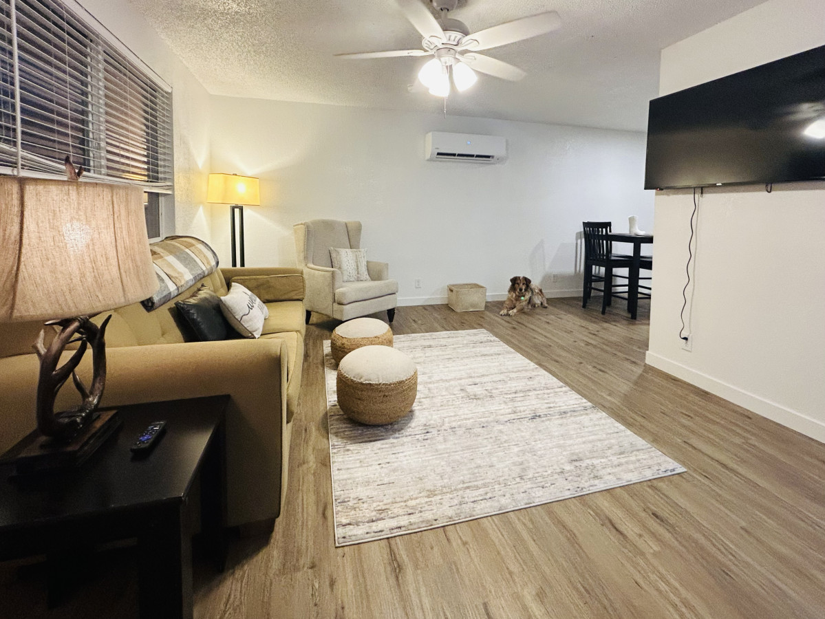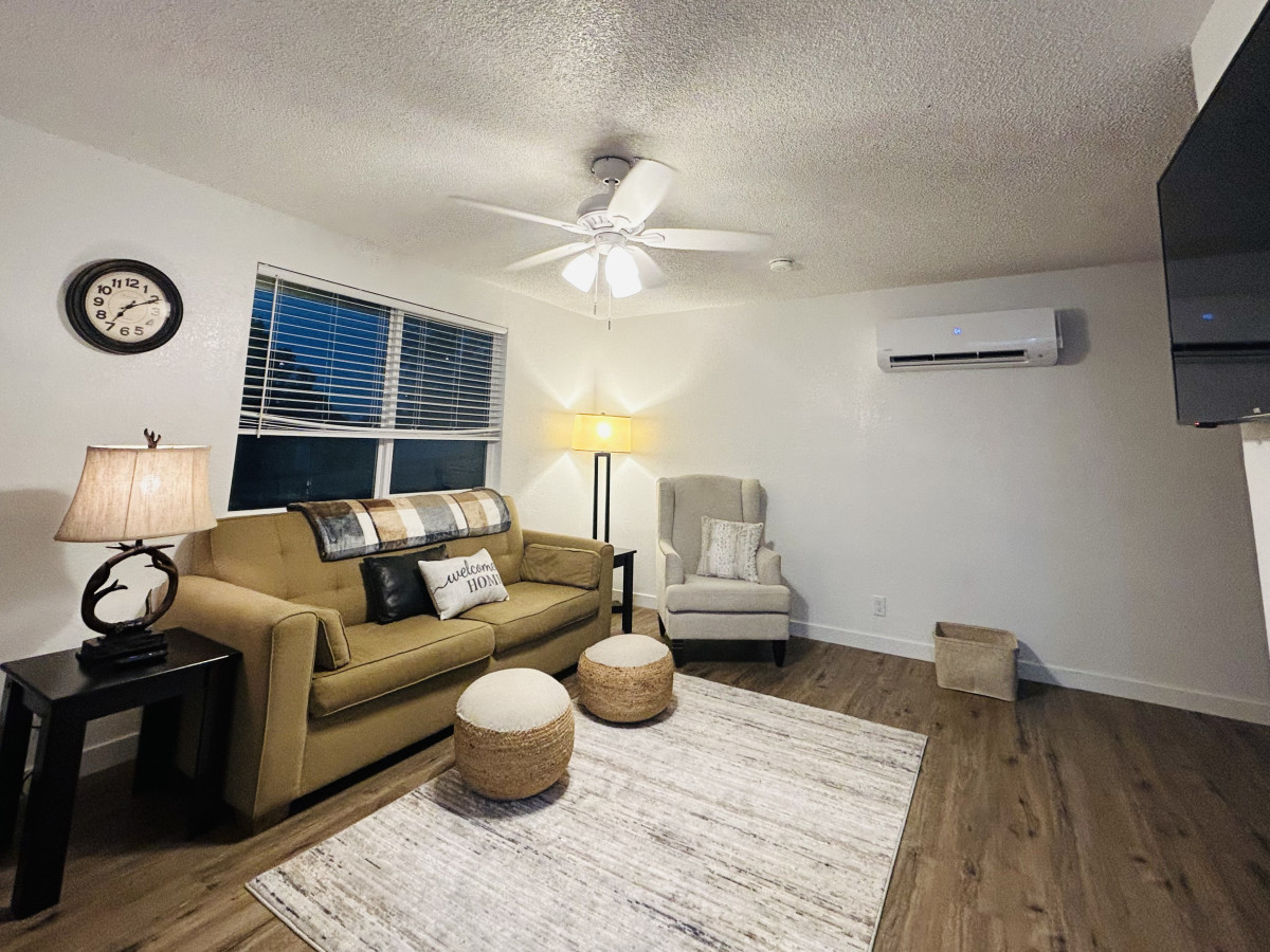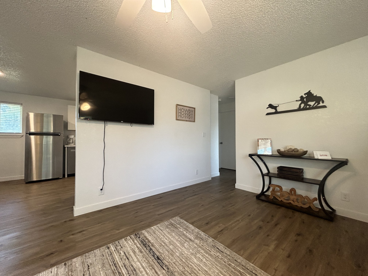 Step inside and kick back and relax in the cozy living room, where a brand-new, plush couch invites you to unwind after a day of adventure. Styled with Western-inspired accents, this comfortable space is perfect for watching a movie on the smart TV or gathering around for game night. The rustic touches give it a warm, inviting feel, making it an ideal spot to relax and recharge.