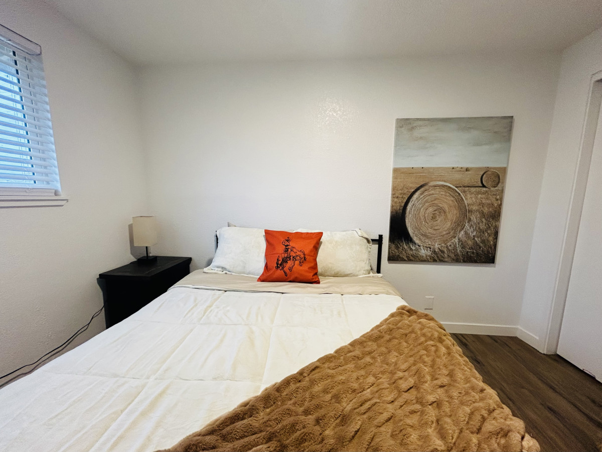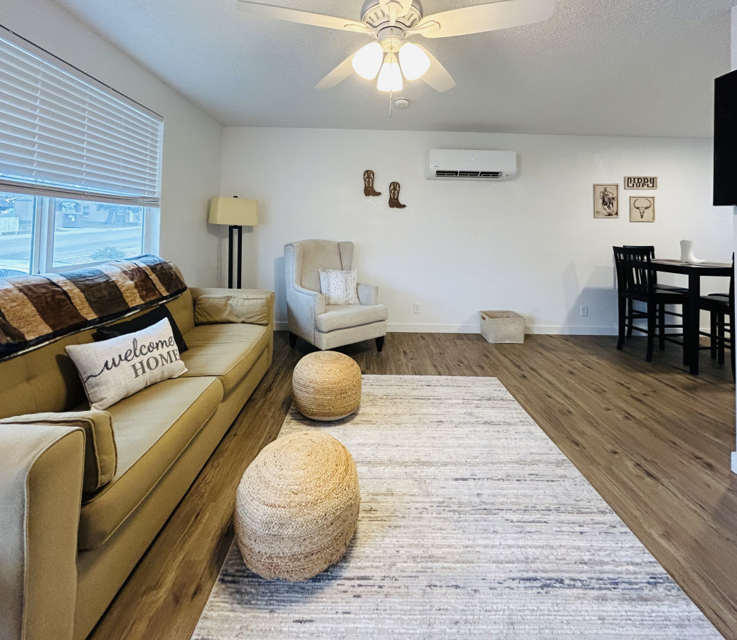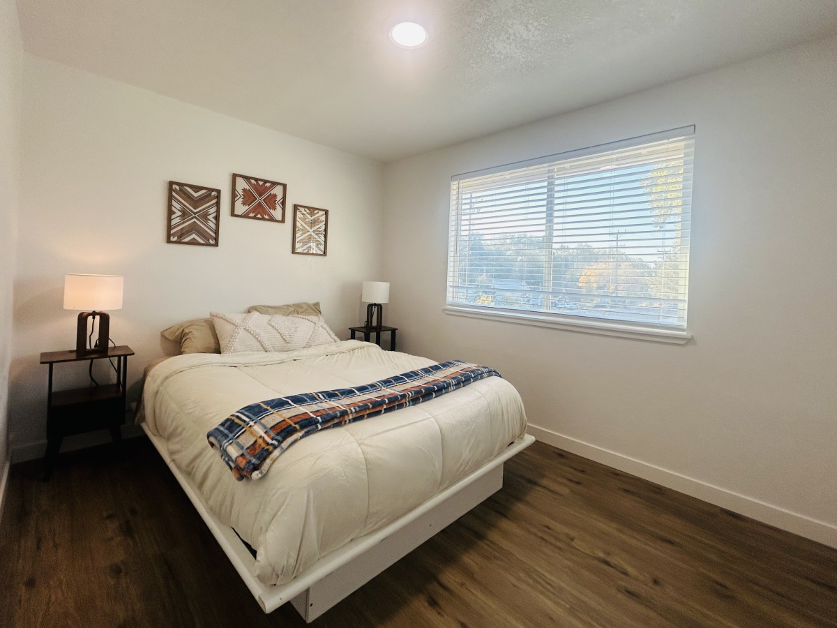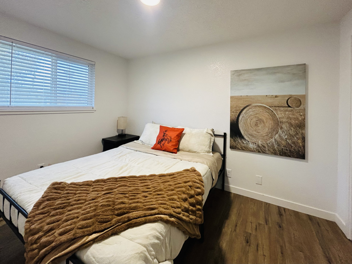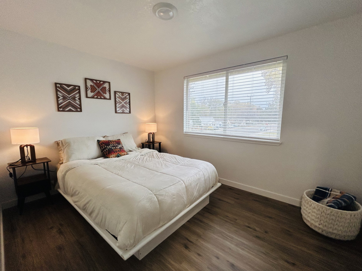 Both bedrooms feature plush queen-size beds, spacious closets, and tasteful Western decor that gives each room its own unique character. Enjoy the open-concept living area, perfect for unwinding after a day exploring Idaho’s countryside or local attractions.