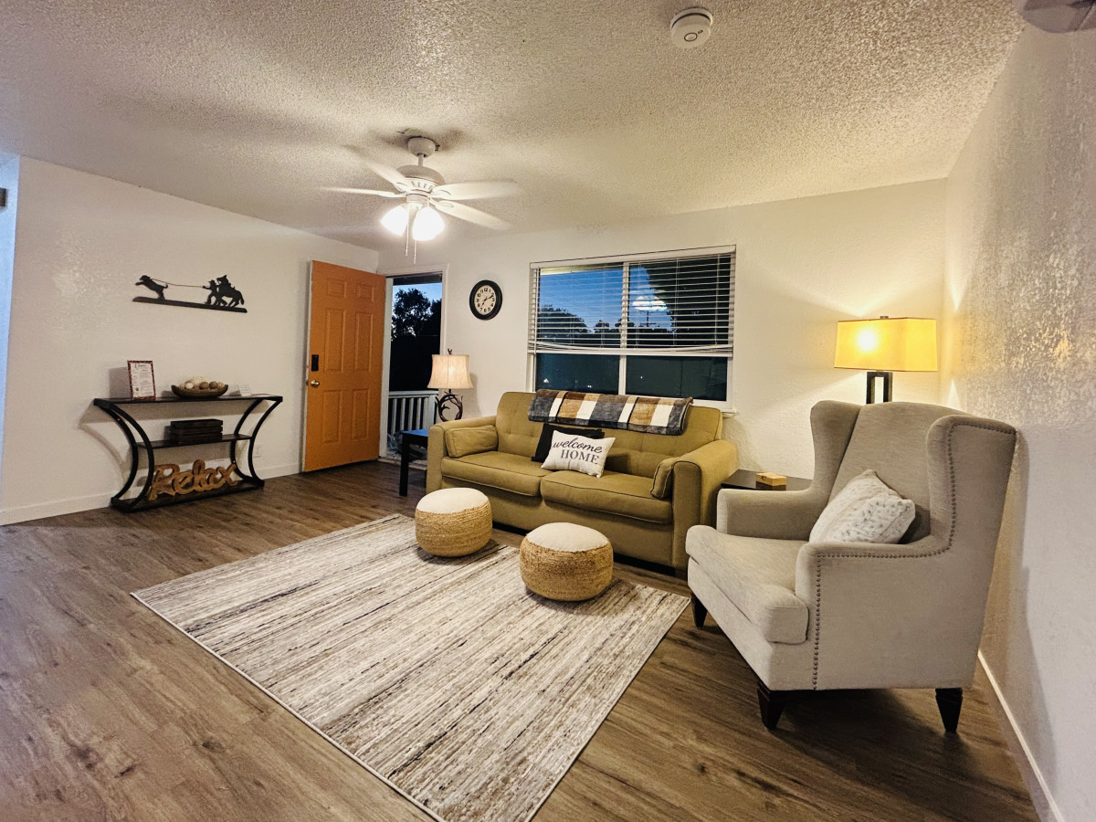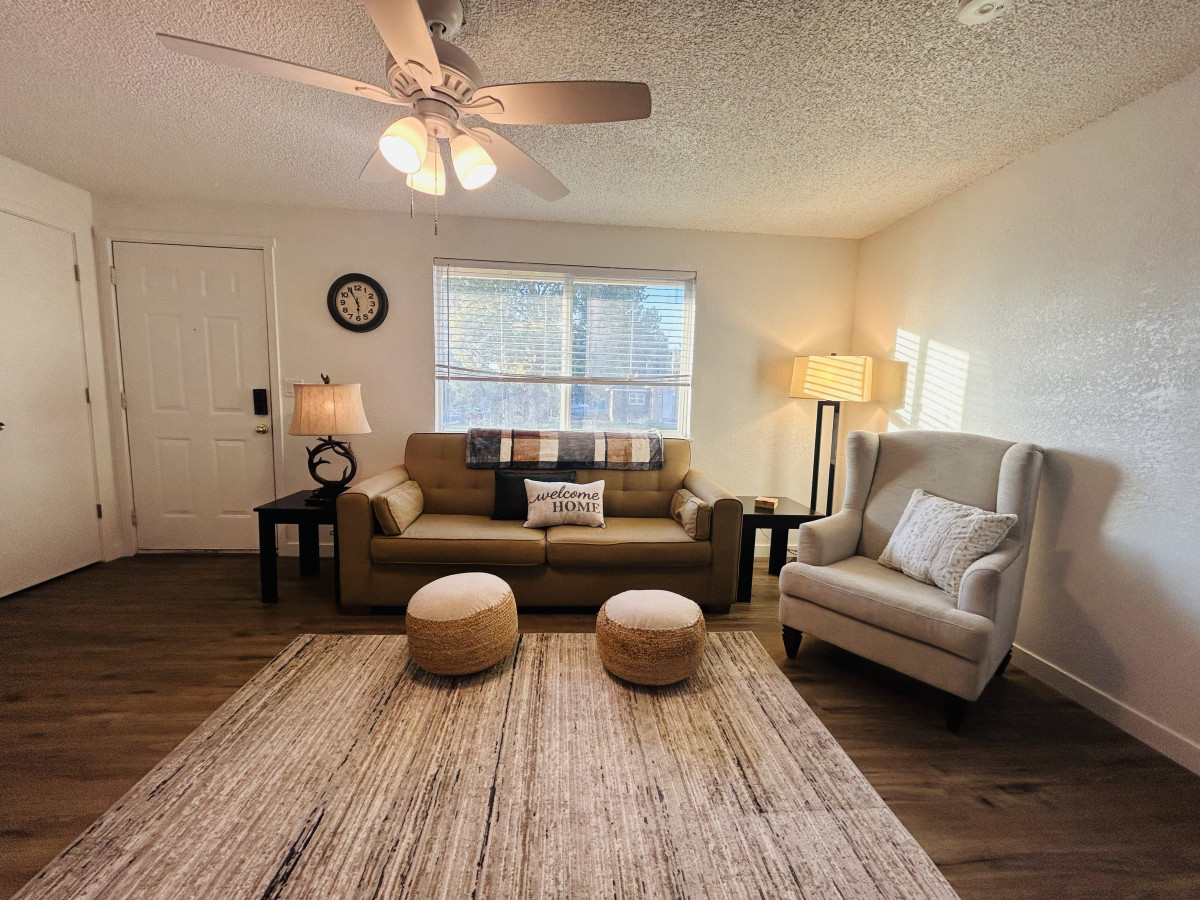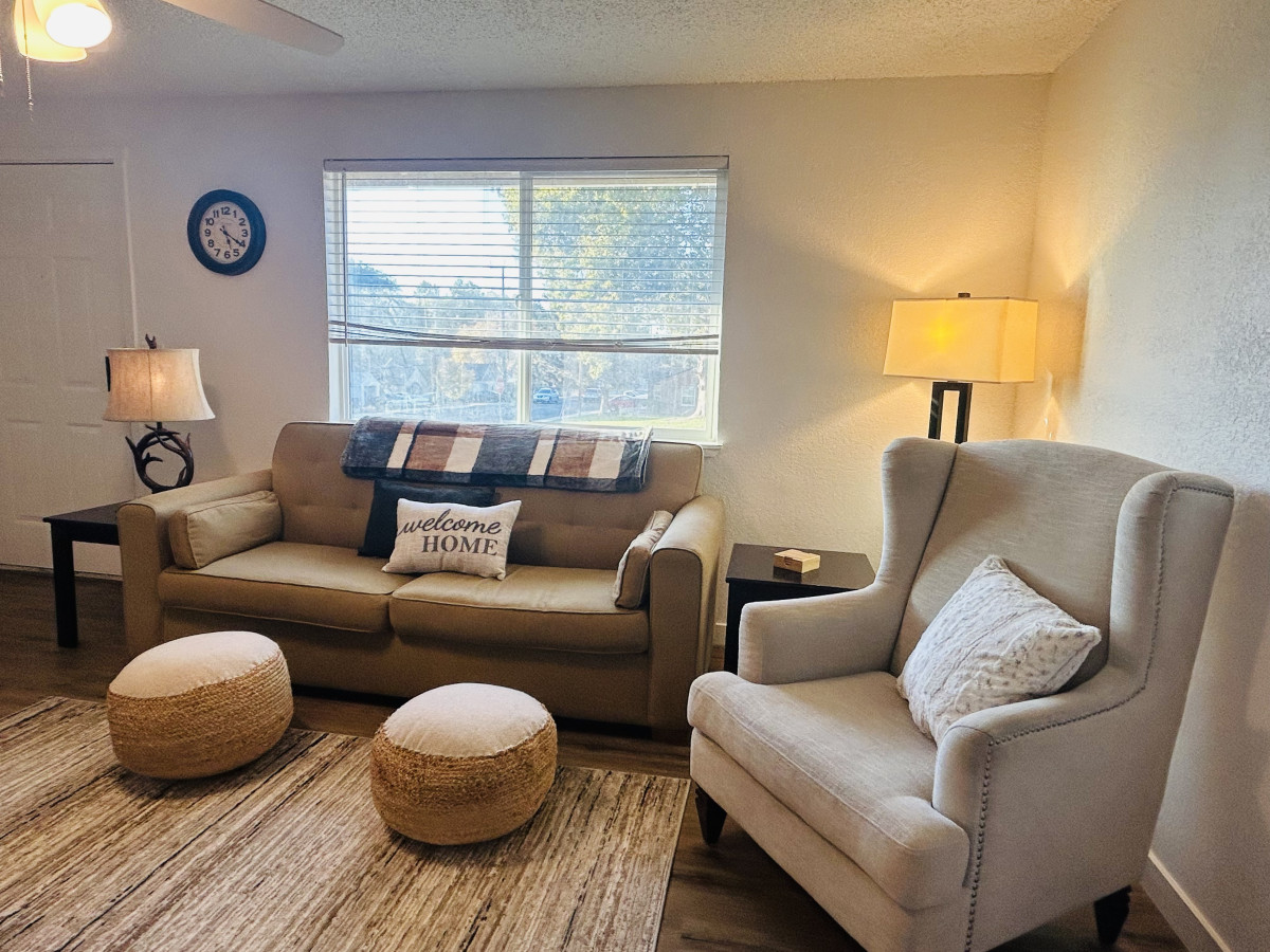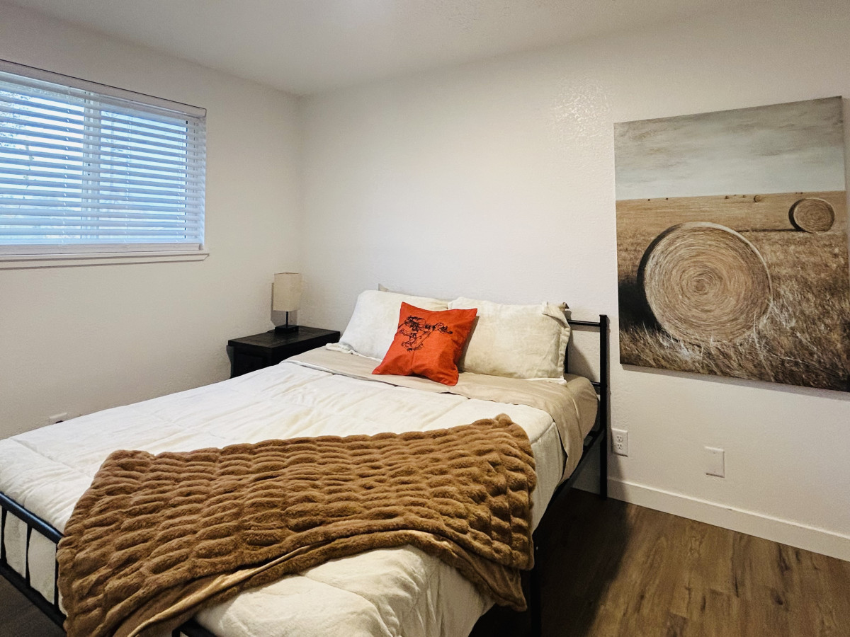 Both bedrooms feature plush queen-size beds, spacious closets, and tasteful Western decor that gives each room its own unique character. Enjoy the open-concept living area, perfect for unwinding after a day exploring Idaho’s countryside or local attractions.