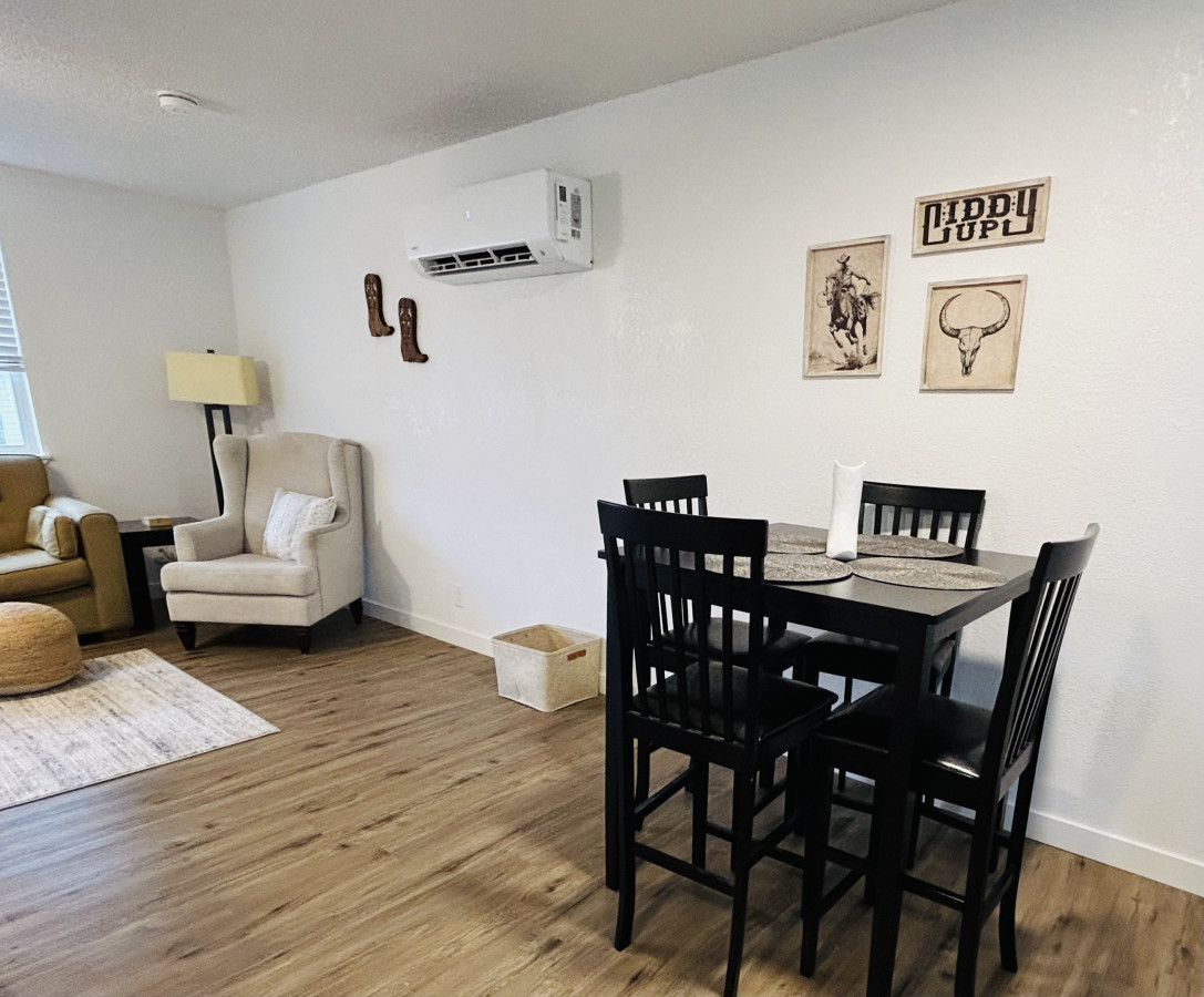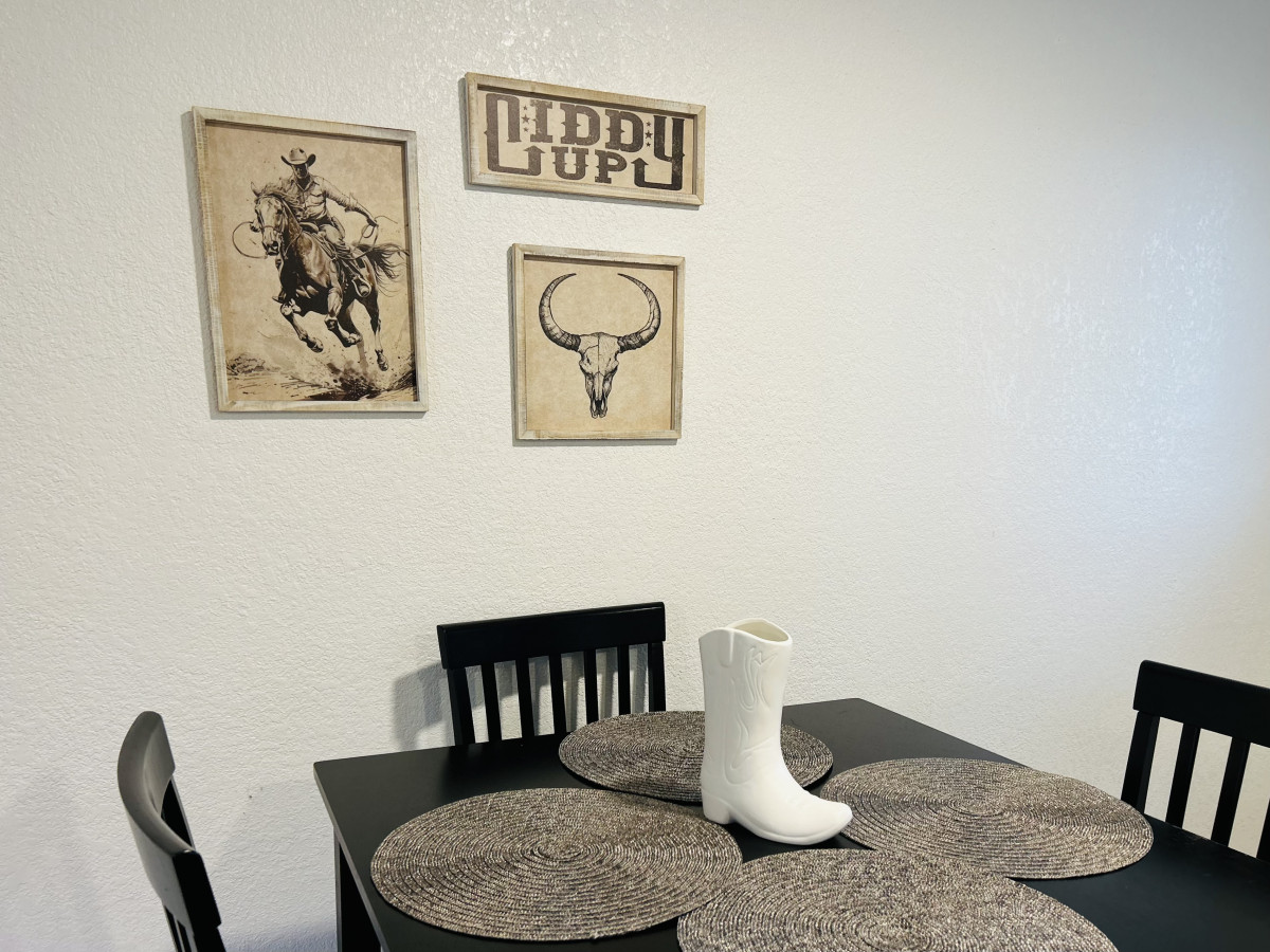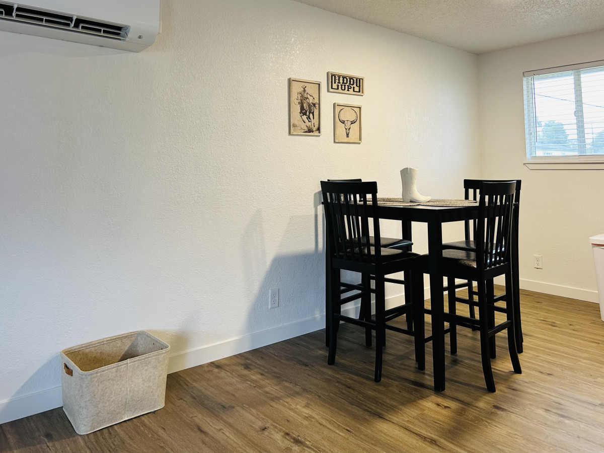 Just off the kitchen, you'll find a charming dining area with a table for four, ideal for sharing meals or planning the day's activities over breakfast. The table is crafted in a rustic style to match the cowboy theme, giving you a true taste of Idaho's countryside right at home.
