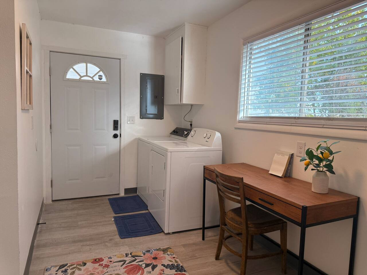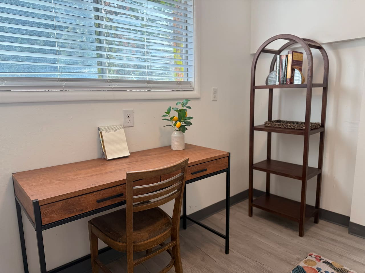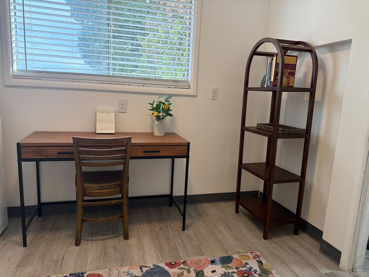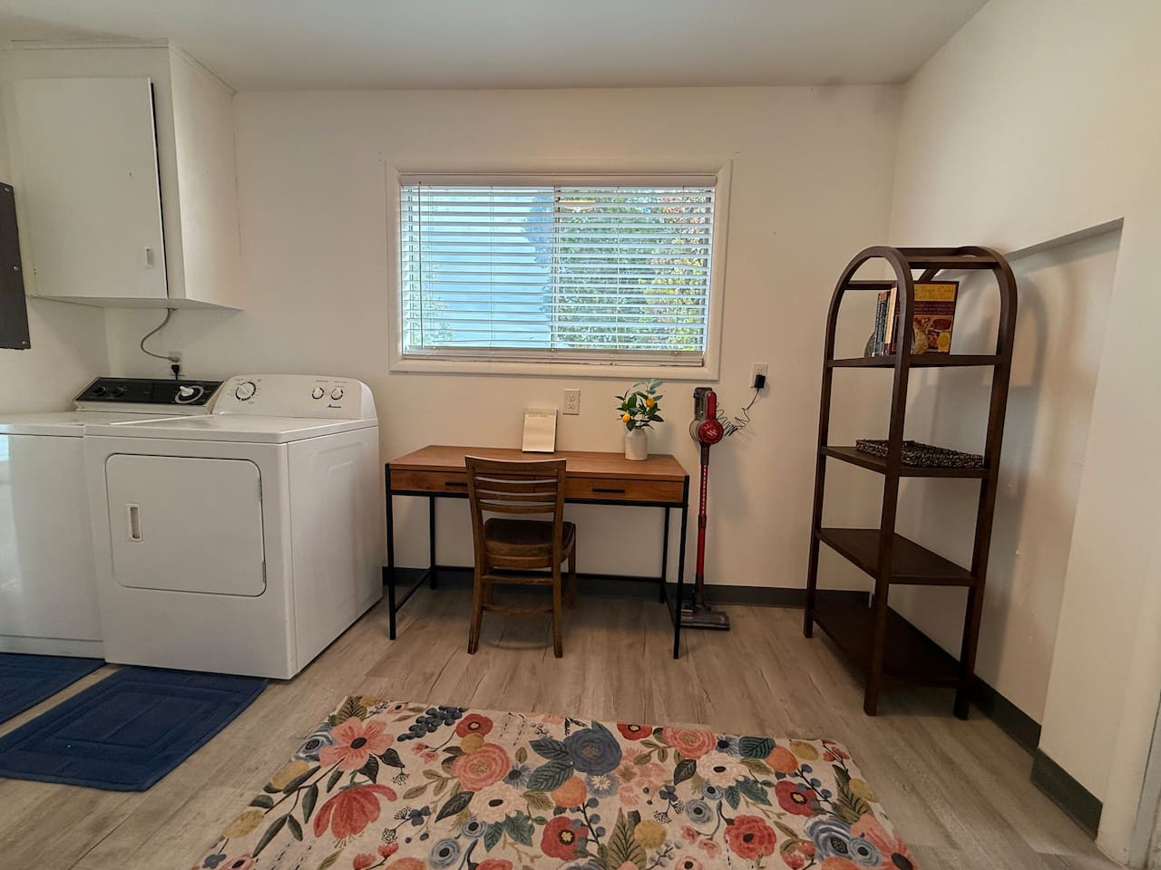 The home is equipped with a modern office space, decorated in sleek black and cream tones with calming green, nature-inspired touches. It was perfect for catching up on a bit of work or journaling about your trip. There is ample parking for our truck and our friend’s RV.