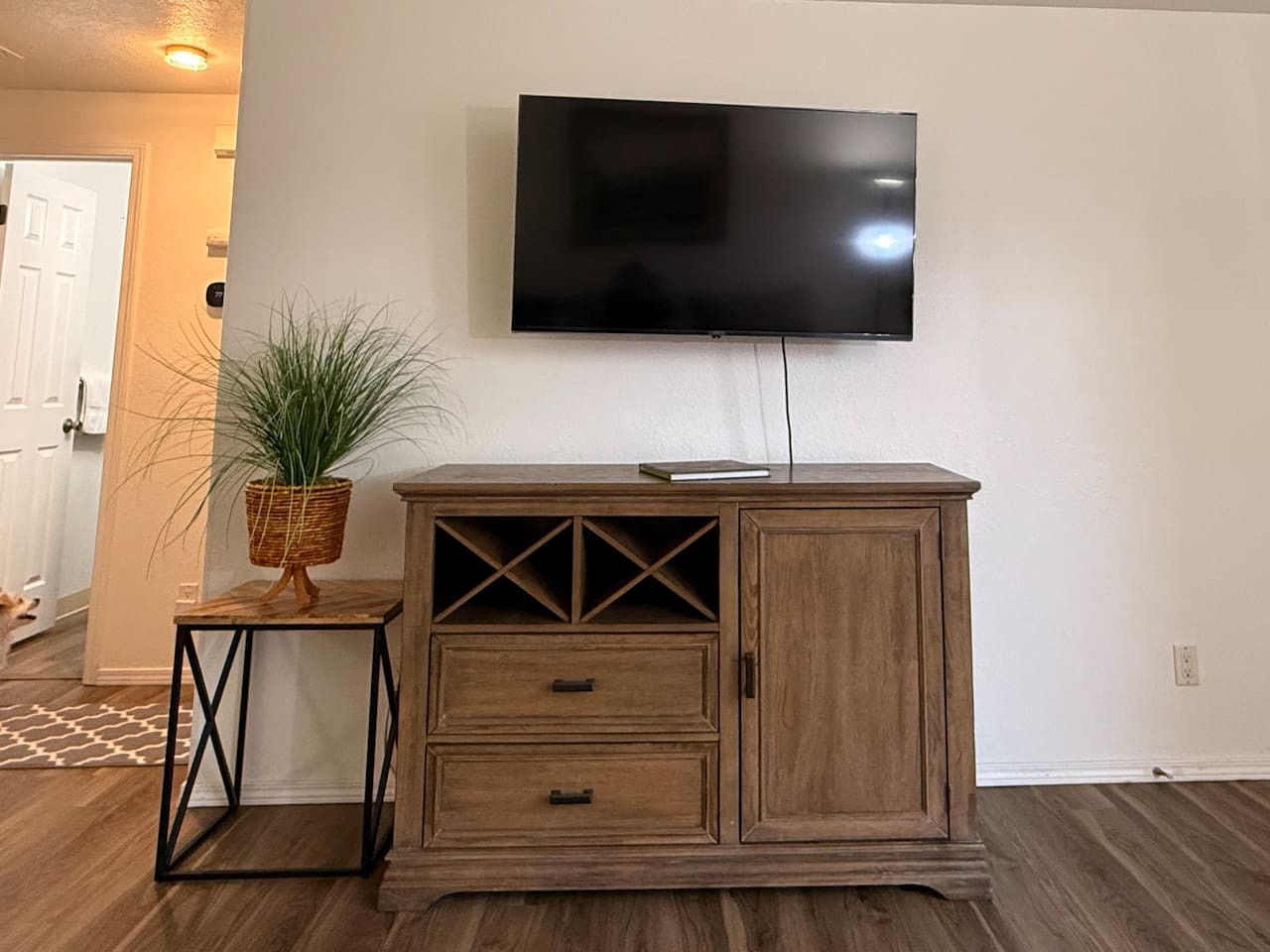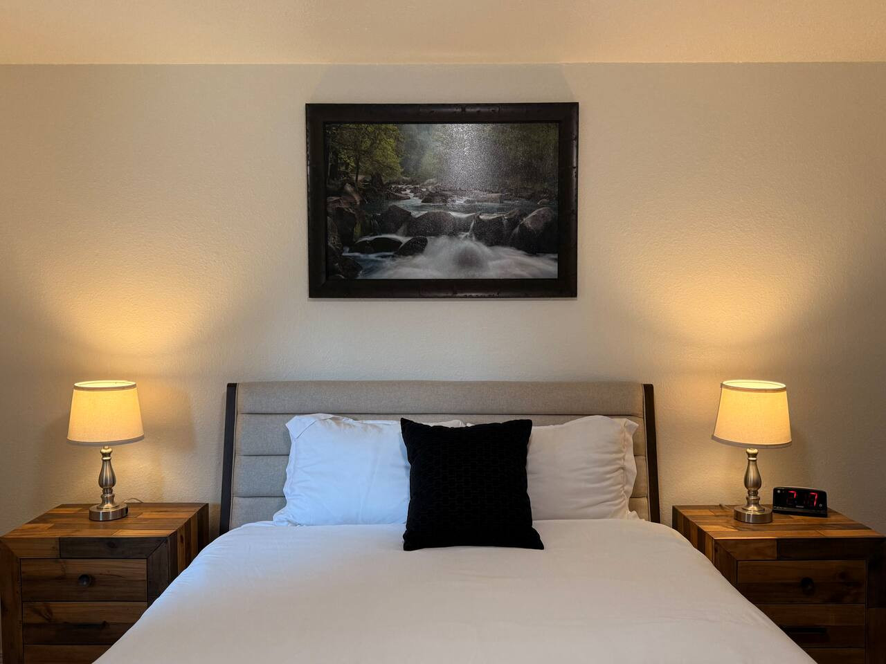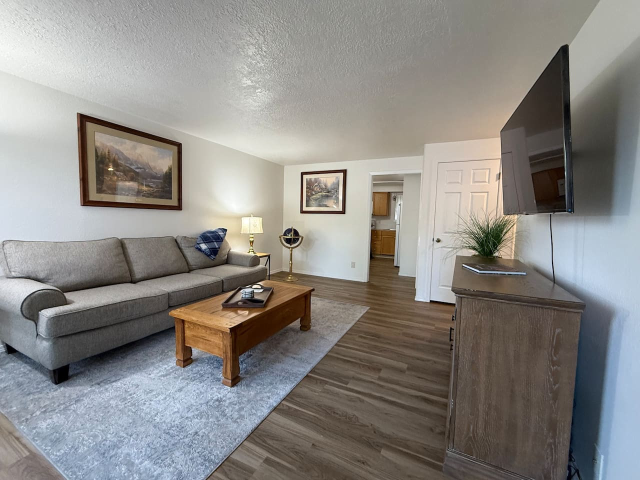 You’ll settle into one of two comfortable bedrooms, each with a queen bed and its own personality — one anchored in the spirit of the sea, the other flowing with the charm of Idaho’s rivers. The full bathroom with a walk-in shower adds both ease and comfort to your stay. In the living room, you can unwind in front of the Smart TV, or simply enjoy the peaceful glow of the artwork that gives the home its gentle, timeless feel.