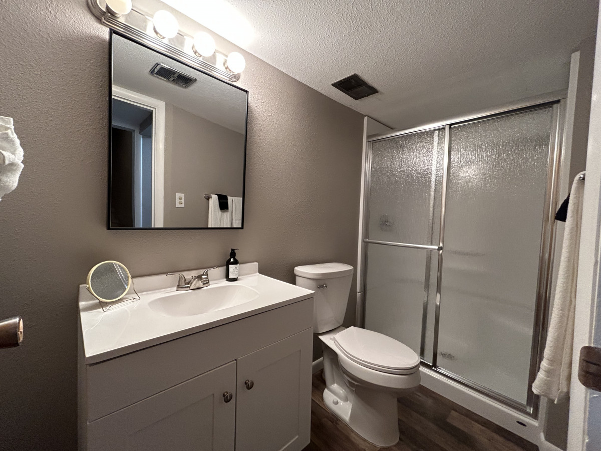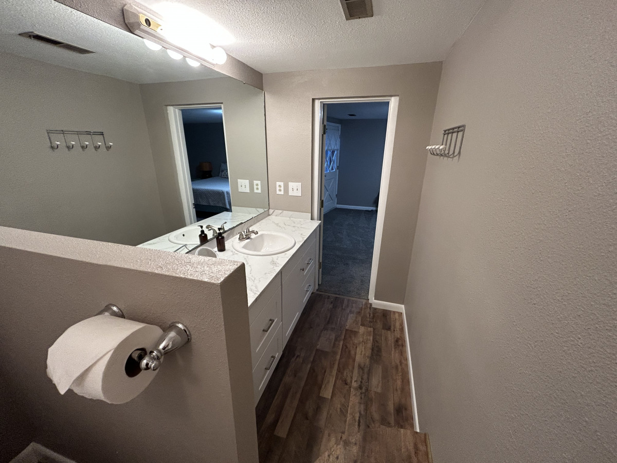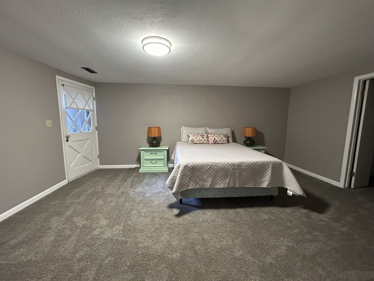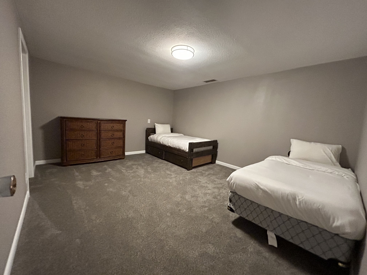 Head downstairs and find another living room and 3 more bedrooms and two brand newly remodeled bathrooms! Plus, a private entrance to the expansive back yard. The downstairs family room has a smart TV and a queen size pull out couch. There are 3 separate bedrooms. One has a queen size bed plus a queen size futon. One bedroom has 2 twin beds and the last has a queen size bed. There is a ginormous walk-in closet between the bedrooms with the two twin beds and the queen bedroom for both to share. There are also two full bathrooms downstairs as well.