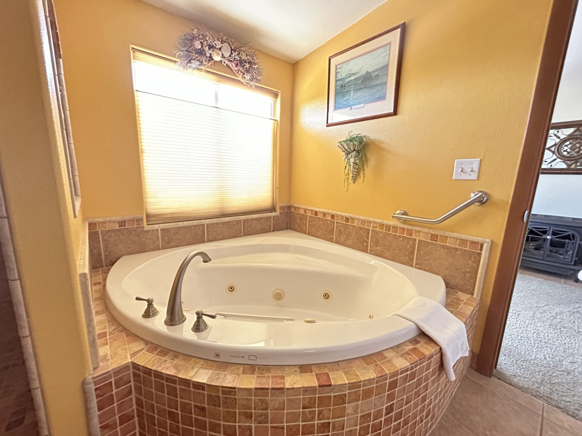 Three well-appointed bedrooms await when you get sleepy. With more vacation essentials like an in-home washer/dryer and central AC, the only question left is how many extra days to book. Upstairs you'll find a gorgeous living room with classy white leather couches, a nook with a piano for your playing and a large fully stocked kitchen with a Keurig coffee maker and children's Plates+Cups, There is an adjoining table that seats 4 along with four bar stools. This kitchen/dining space opens up to the wonderful living room with panoramic windows for million dollar views. Here, you'll find a smart TV you can watch from comfy leather brown leather couches. Down the hall is a full bathroom with a shower/tub combo, a large bedroom with a queen size bed, the master bedroom with an en-suite sitting area, and huge master bathroom! Inside the master bedroom, is a workout recumbent bicycle, a sitting room with two rocking chairs and a TV and a door to a patio outside. Then, the master bathroom in the back is so private and boasts a large jacuzzi tub, walk in shower in stone walls, a separate room for toilet and huge master closet.