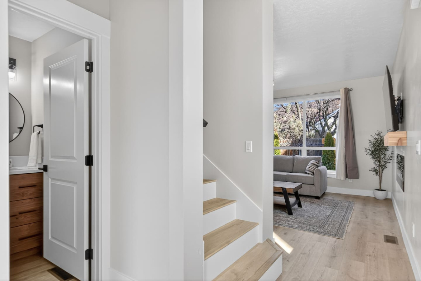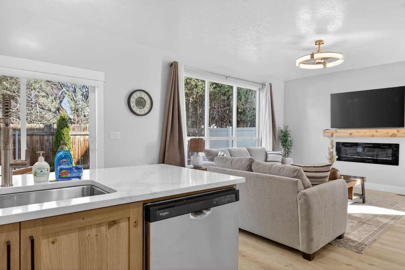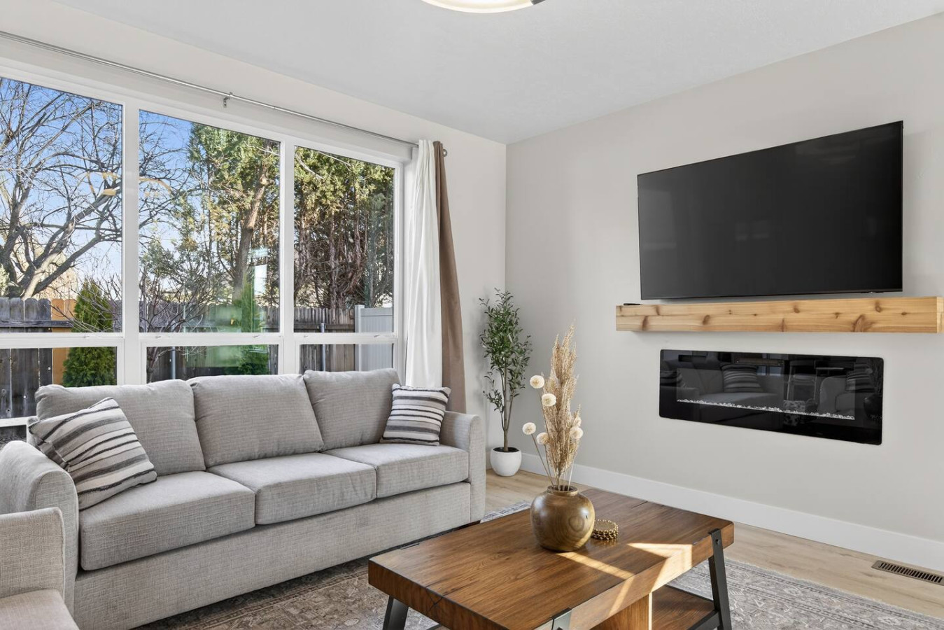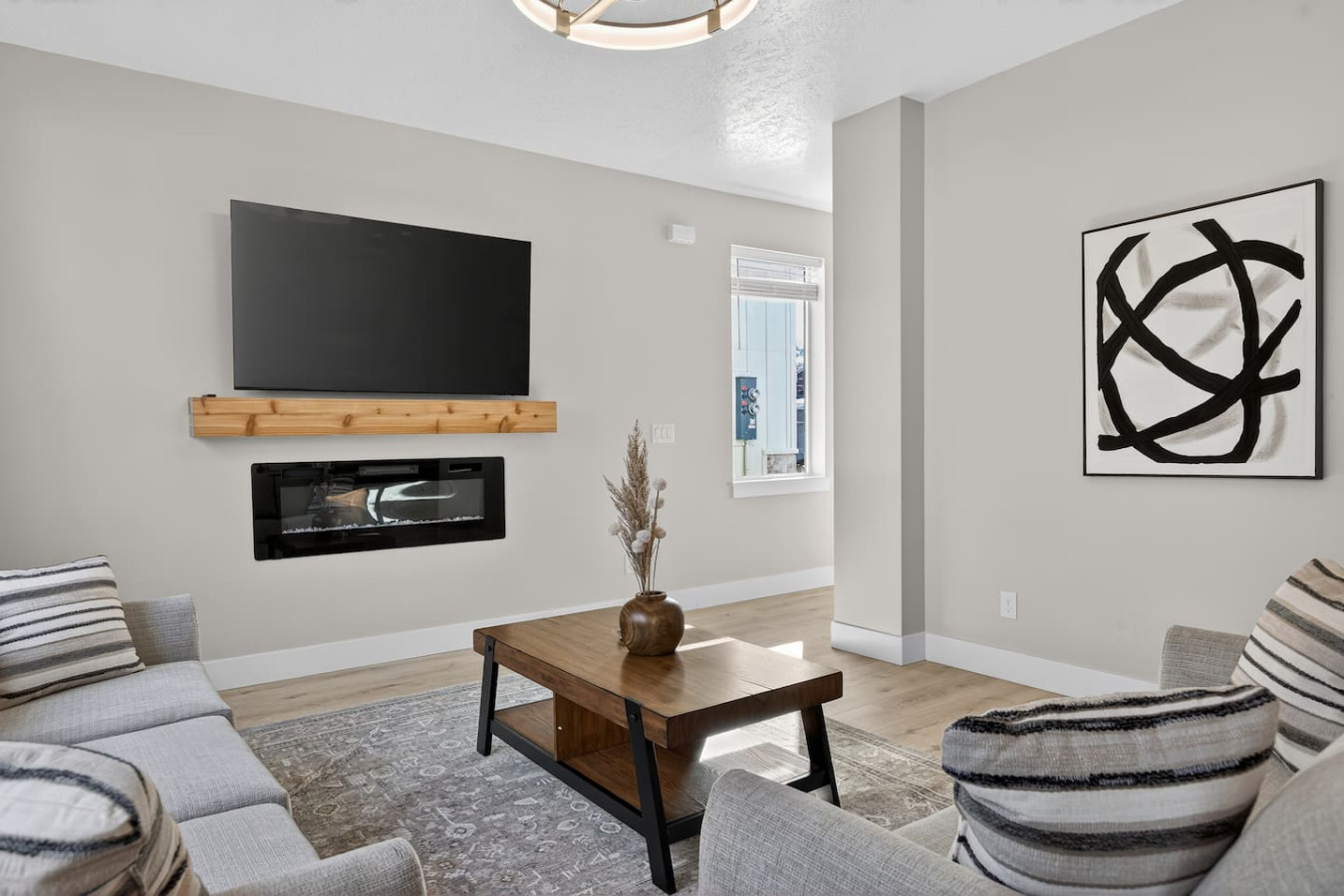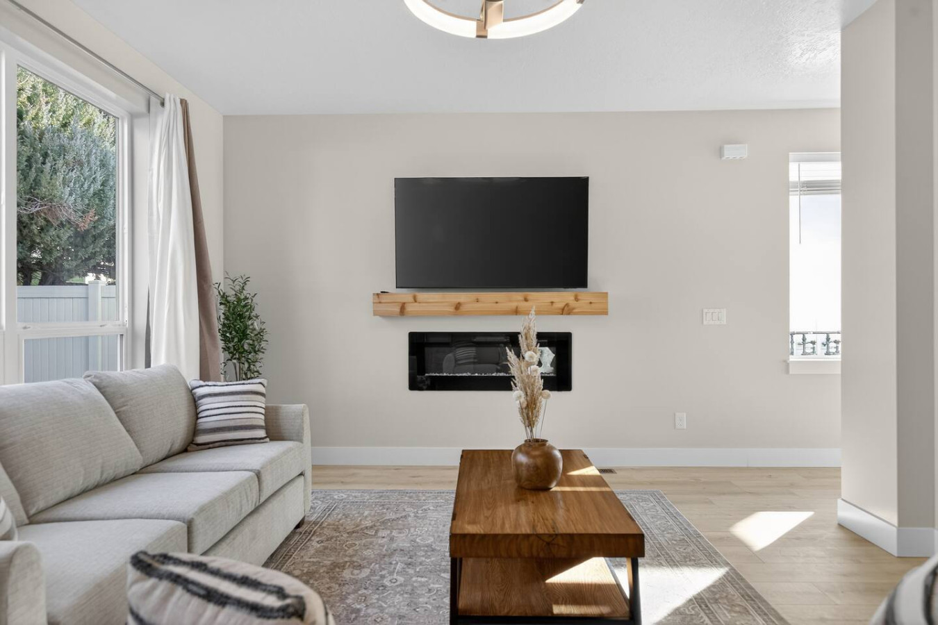 Inside you’ll find a bright open layout with clean modern design, warm wood tones, and sleek lighting fixtures that create a calm and timeless atmosphere. The living room is centered around a modern wall-mounted electric fireplace, providing a cozy focal point for relaxing evenings after a day of exploring.