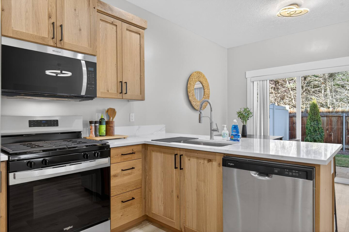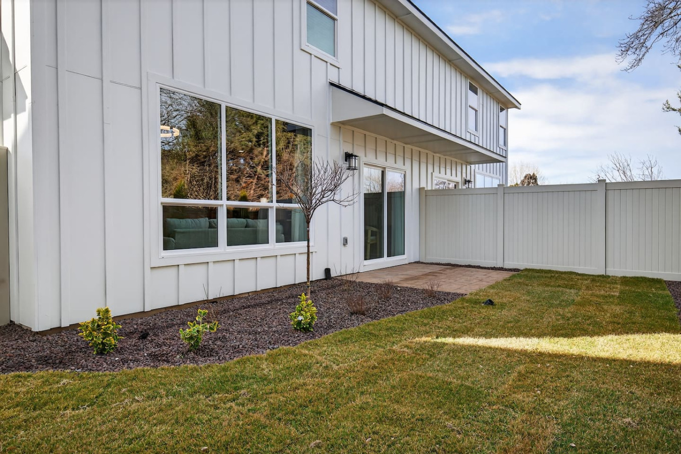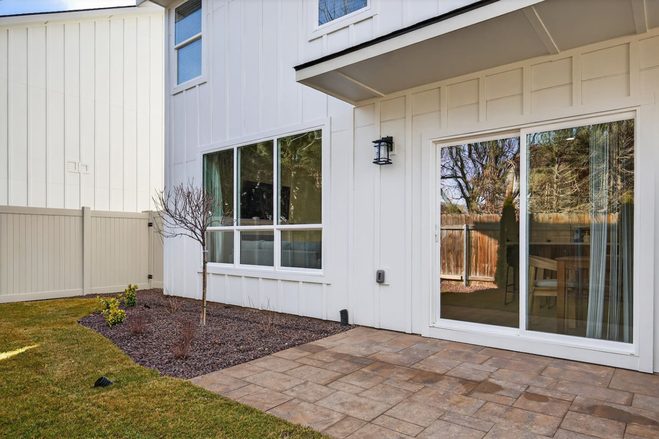 Relax in this newly built modern townhome with a king primary suite and two queen bedrooms. The open living space features an electric fireplace, contemporary lighting, and customizable color ceiling lights for a unique ambiance. Cook in the fully stocked kitchen with granite countertops and modern appliances. Guests enjoy a private fenced yard, small patio, pet-friendly stay, and 2-car garage. Designed with clean lines, warm wood tones, and minimal décor for a calm, stylish stay.