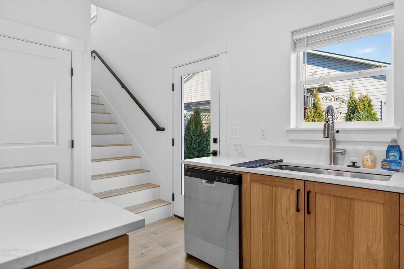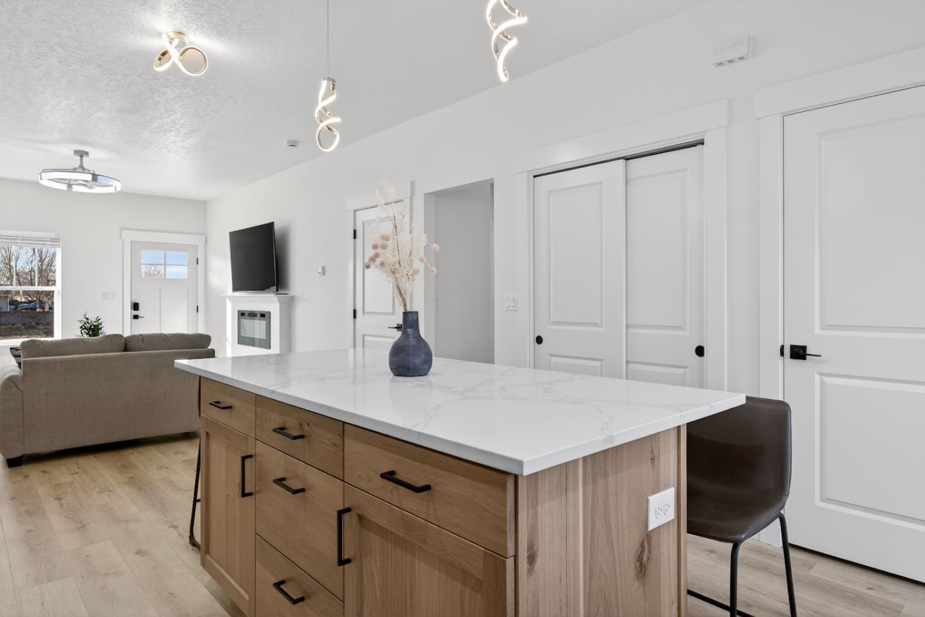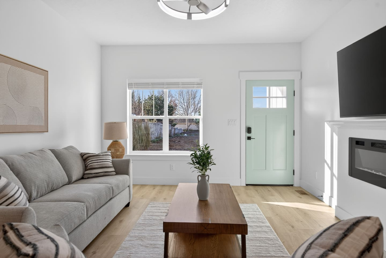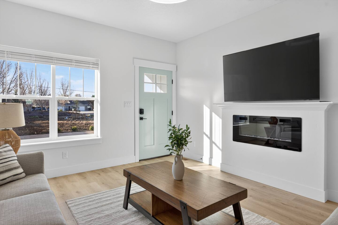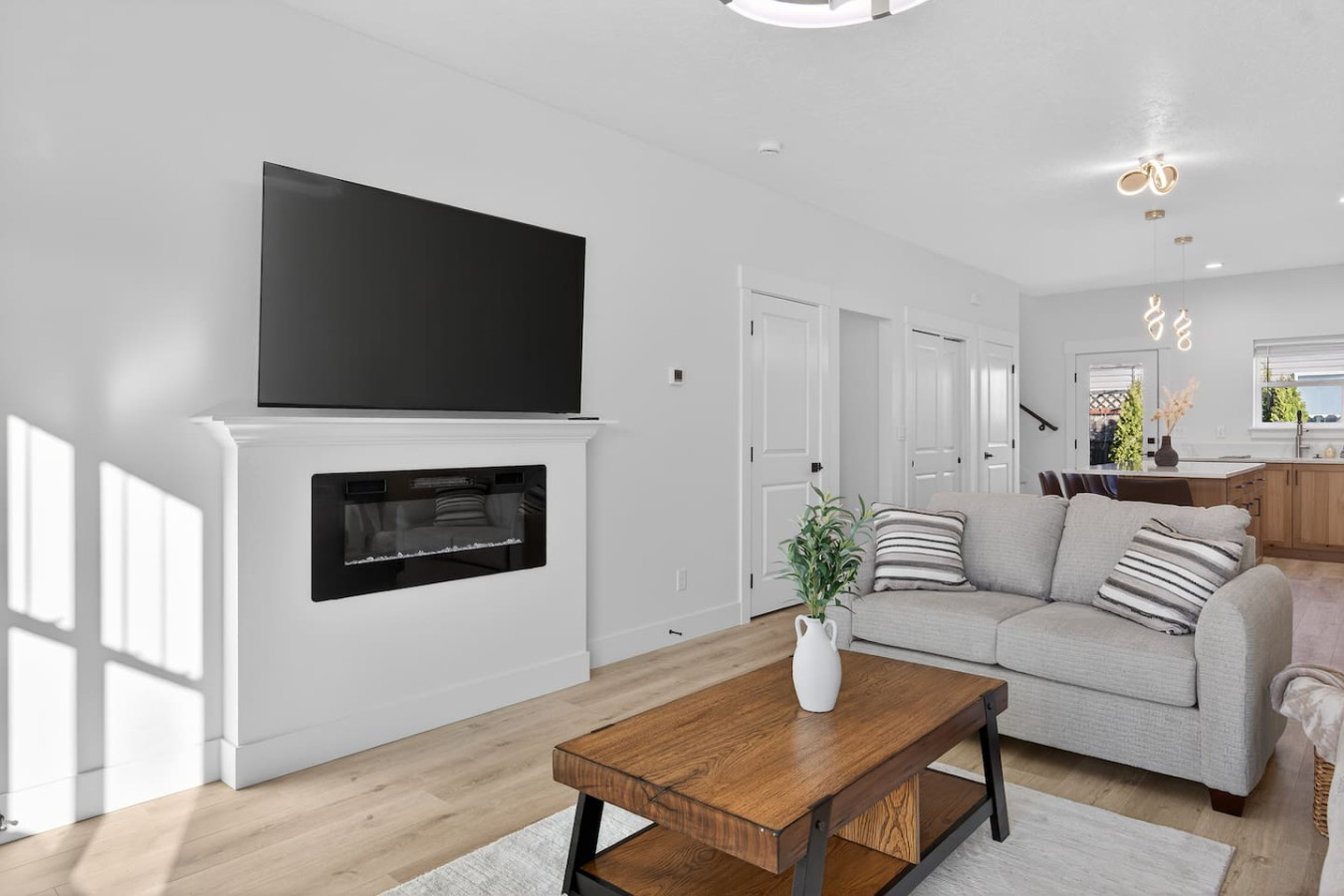 Inside you’ll find a bright open layout with clean modern design, warm wood tones, and sleek lighting fixtures that create a calm and timeless atmosphere. The living room is centered around a modern wall-mounted electric fireplace, providing a cozy focal point for relaxing evenings after a day of exploring.