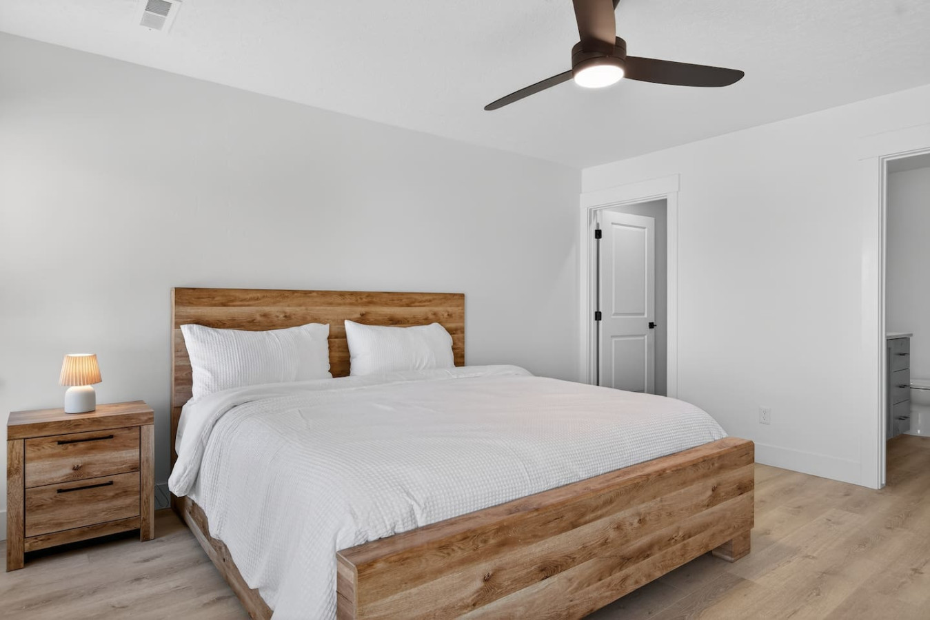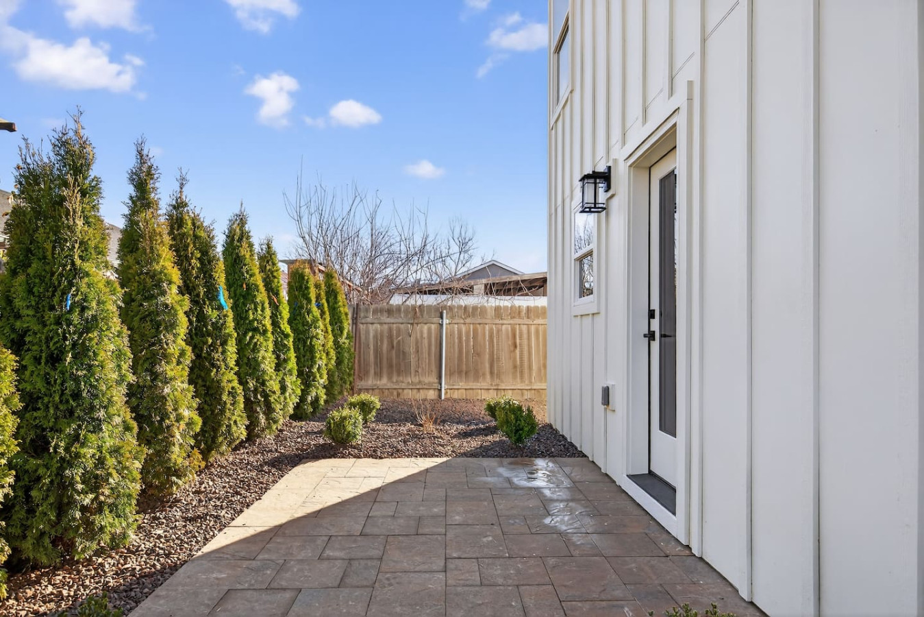 Relax in this newly built modern townhome with a king primary suite and two queen bedrooms. The open living space features an electric fireplace, contemporary lighting, and customizable color ceiling lights for a unique ambiance. Cook in the fully stocked kitchen with granite countertops and modern appliances. Guests enjoy a private fenced yard, small patio, pet-friendly stay, and 2-car garage. Designed with clean lines, warm wood tones, and minimal décor for a calm, stylish stay.