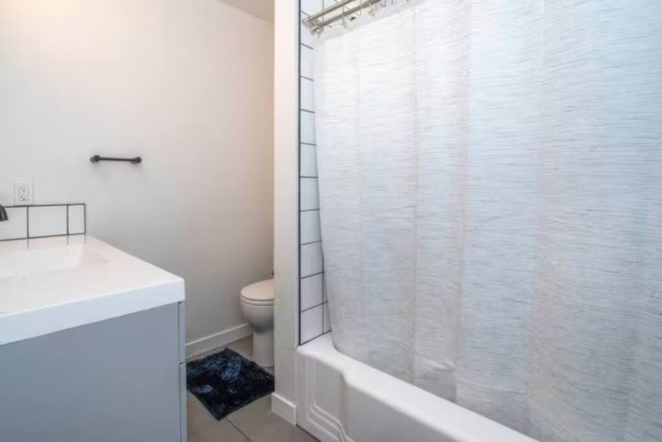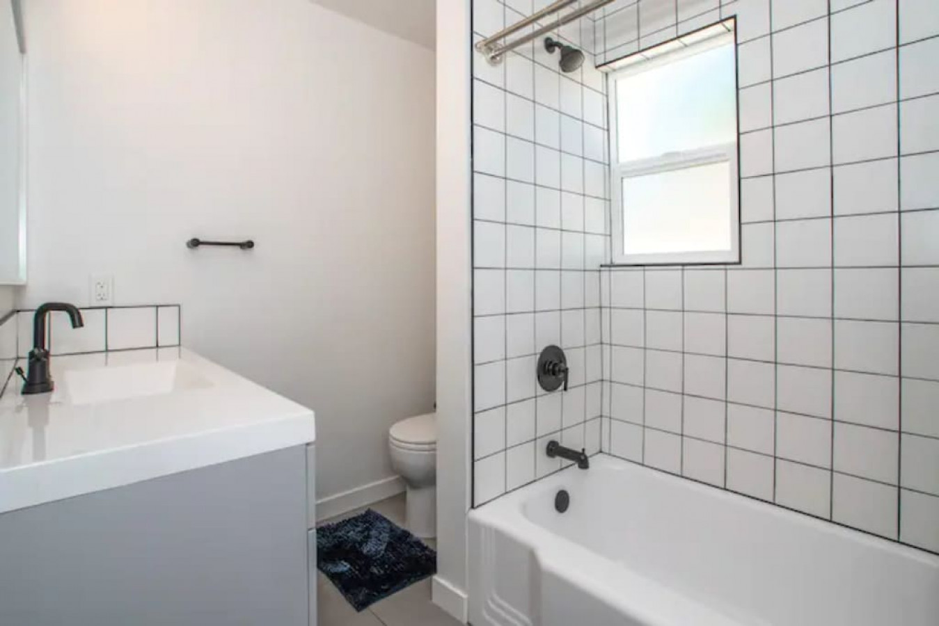 The bathroom is a masterpiece of modern design, featuring modern fixtures and shower/tub where you can unwind and rejuvenate.