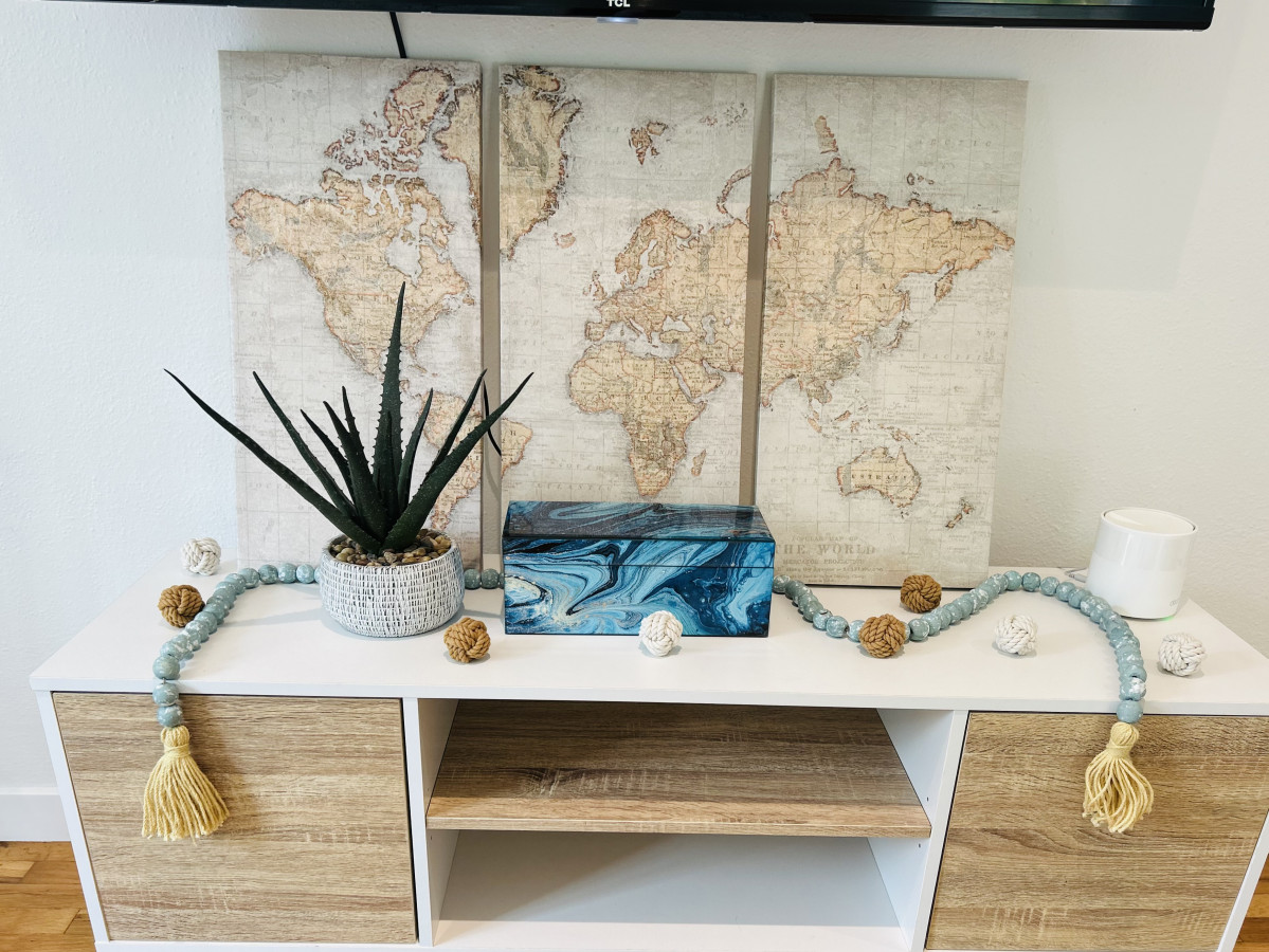 The living room is a cozy haven, featuring plush furnishings and tasteful decor. Unwind on the comfortable sofa while enjoying your favorite shows on the large flat-screen TV, or simply bask in the natural light streaming through the windows.
