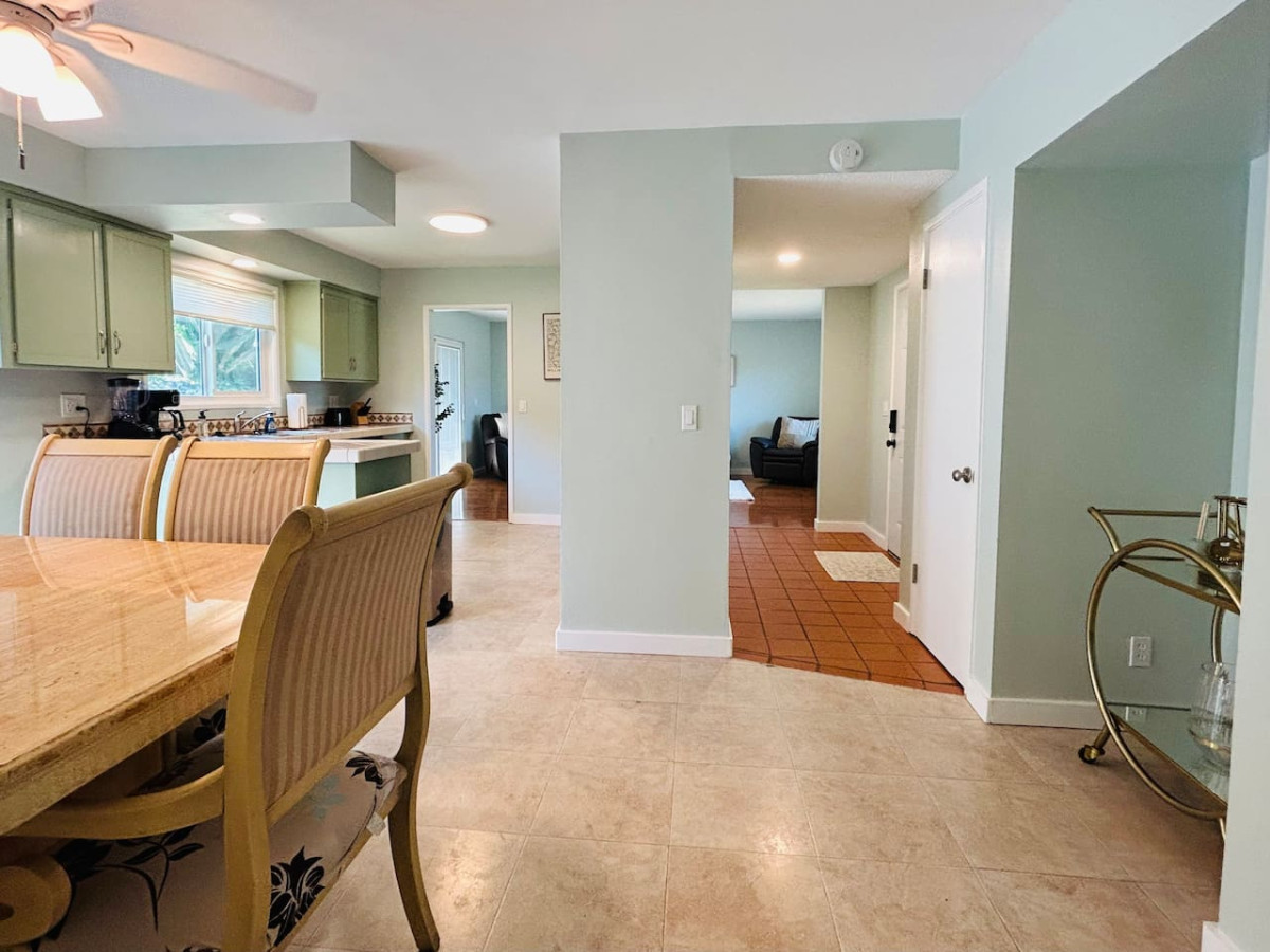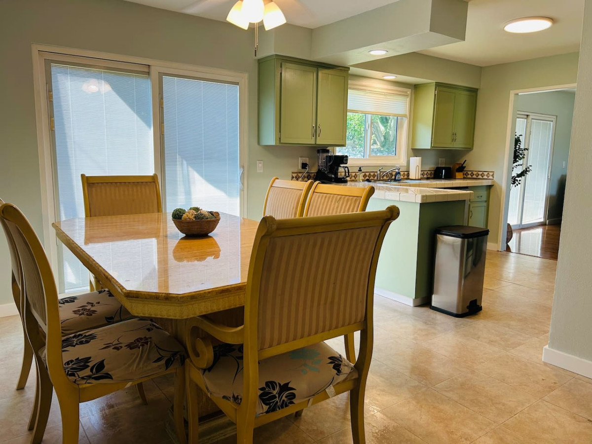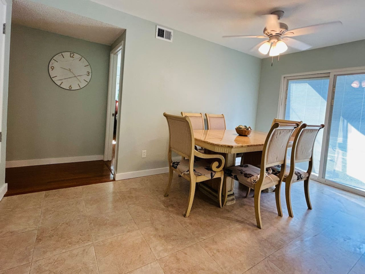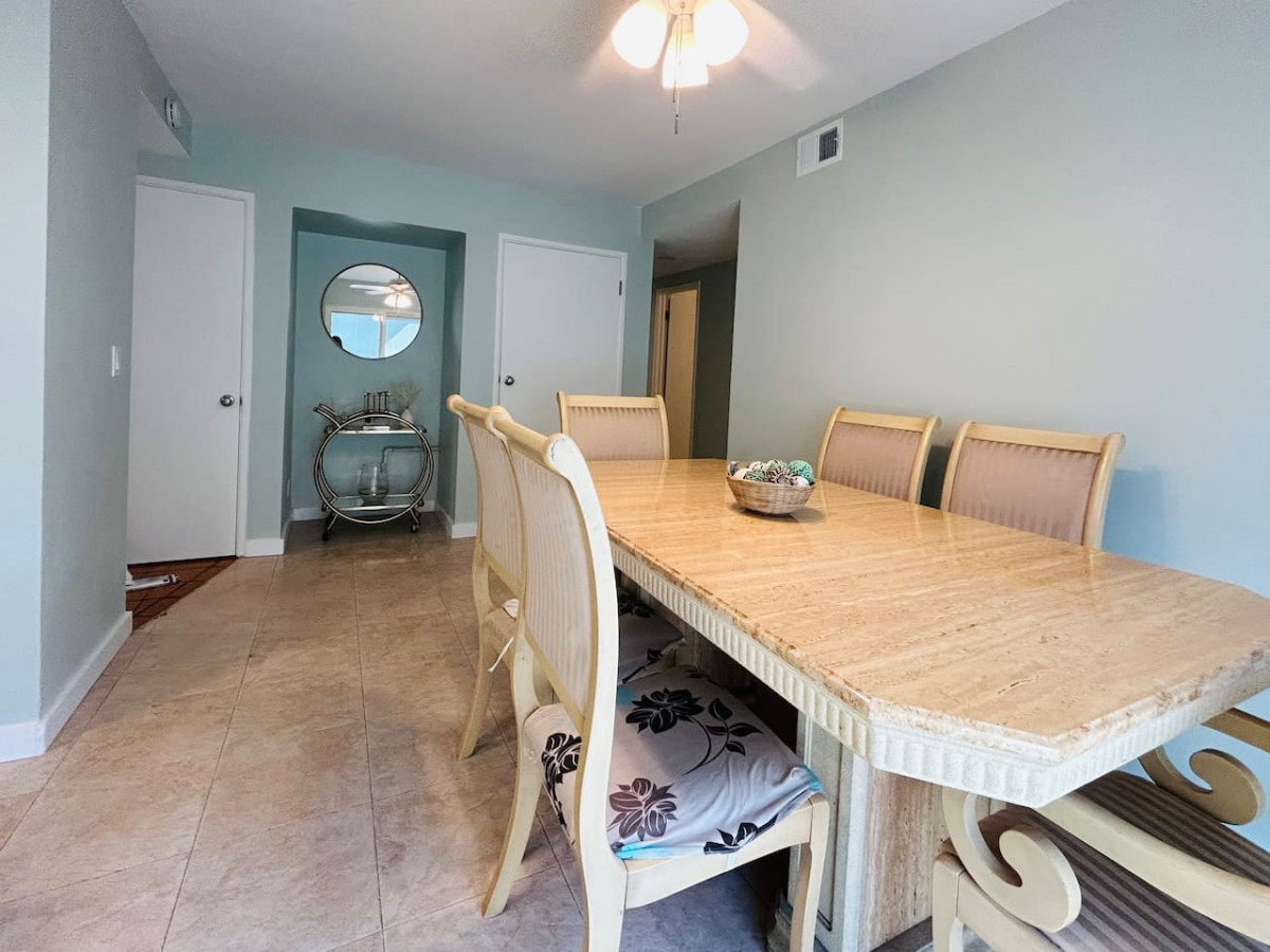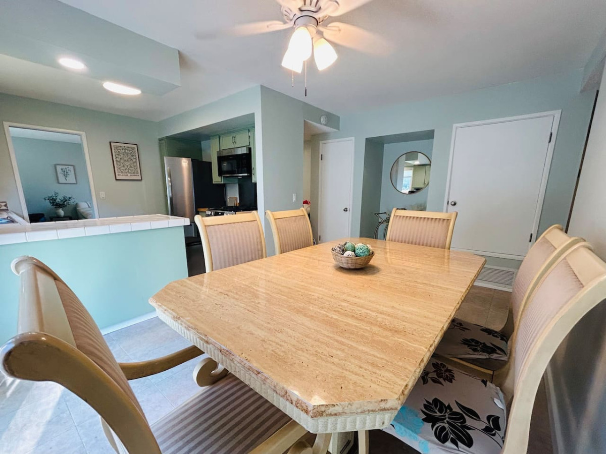 The home’s mini bar is a perfect spot to unwind, and the overly stocked kitchen newly remodeled kitchen with stainless steel appliances is equipped with everything you need to prepare delicious meals. Enjoy these meals at the dining table, which seats six comfortably.