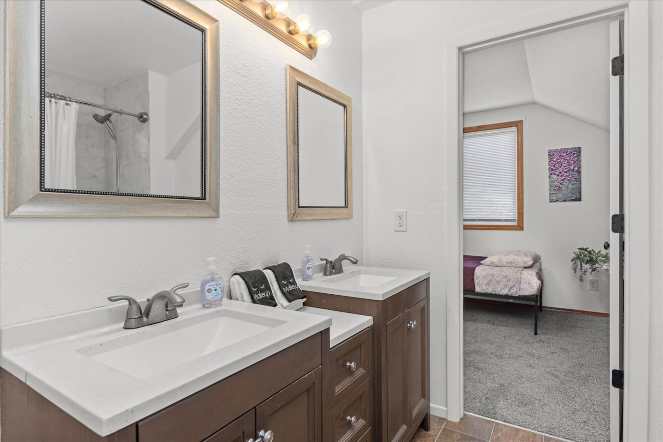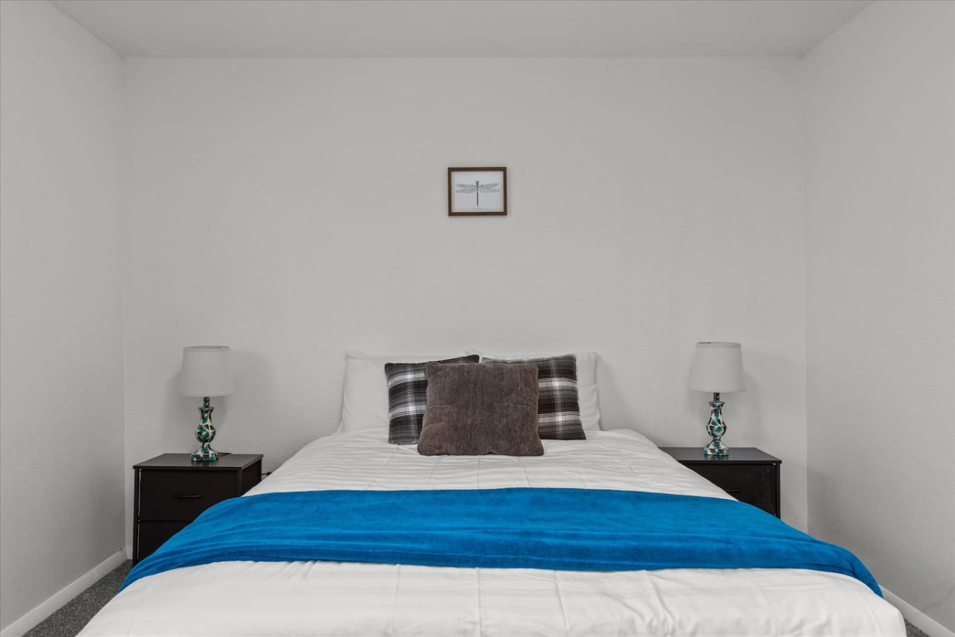 Upstairs, a private small bedroom with a twin bed and a desk and chair serves as a quiet workspace or a comfortable retreat. On the main level, two additional bedrooms—one with a queen bed and one with a full bed—provide restful accommodations for guests.