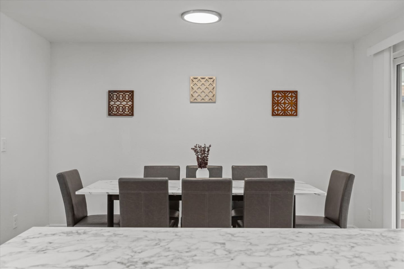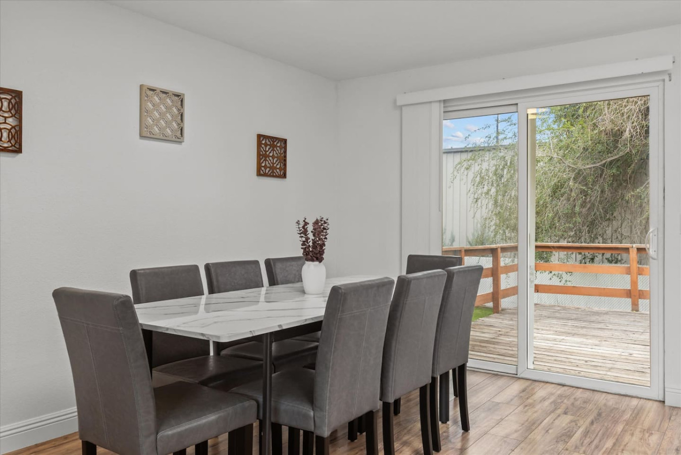 The home features a large, fully stocked kitchen that makes meal preparation a breeze, along with a dining area that seats eight for shared meals or game nights. Outside, the fully fenced-in yard is perfect for pets to play safely, and two balconies—one off the kitchen and one off the bonus room—offer great spots for morning coffee or evening relaxation.
