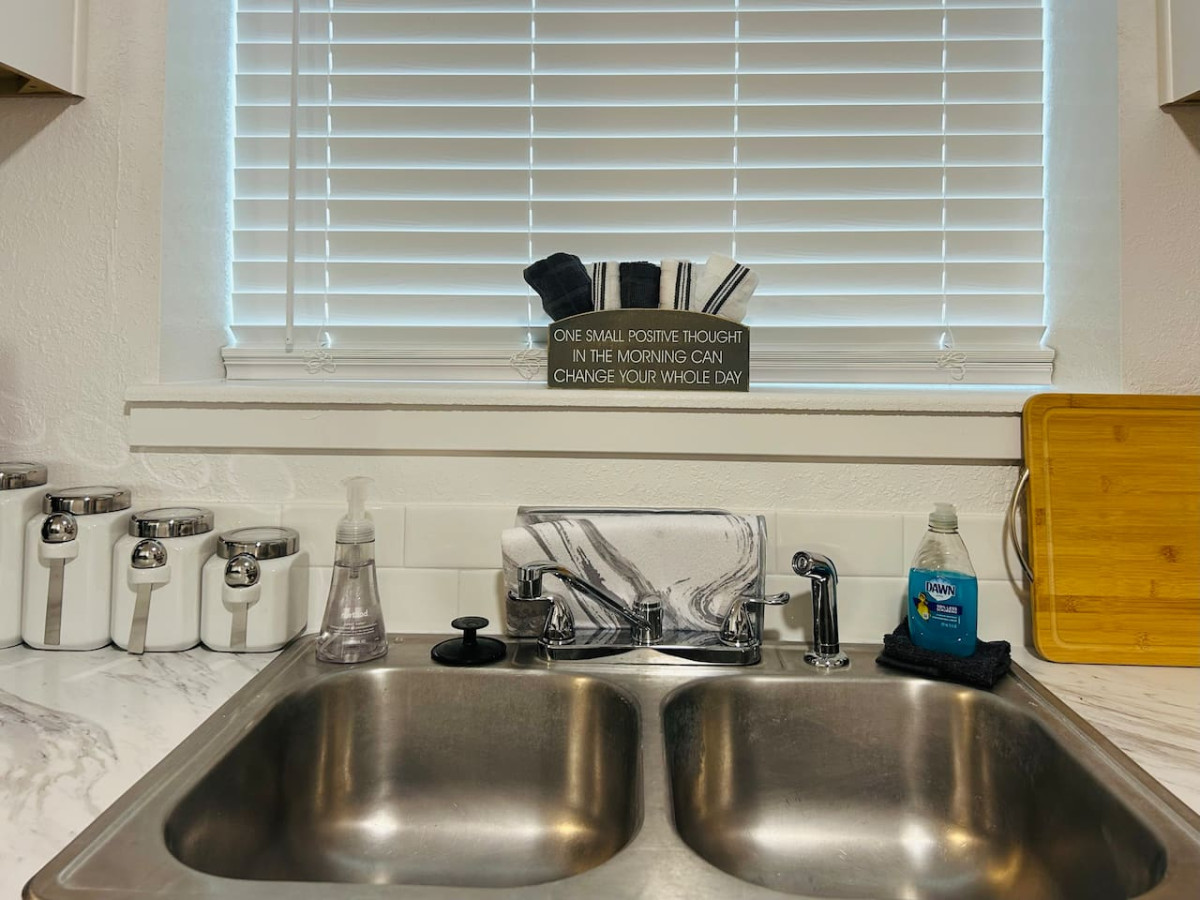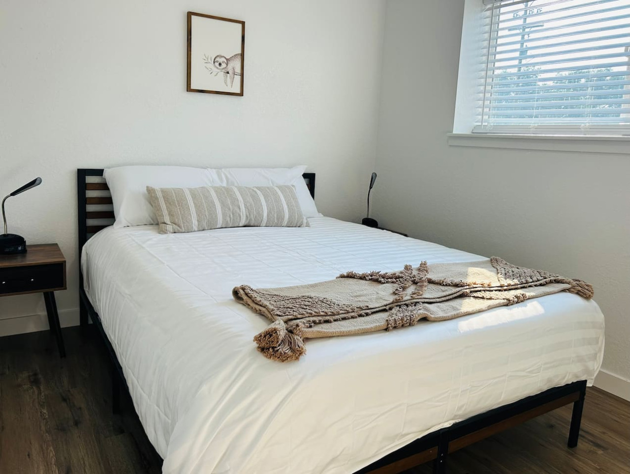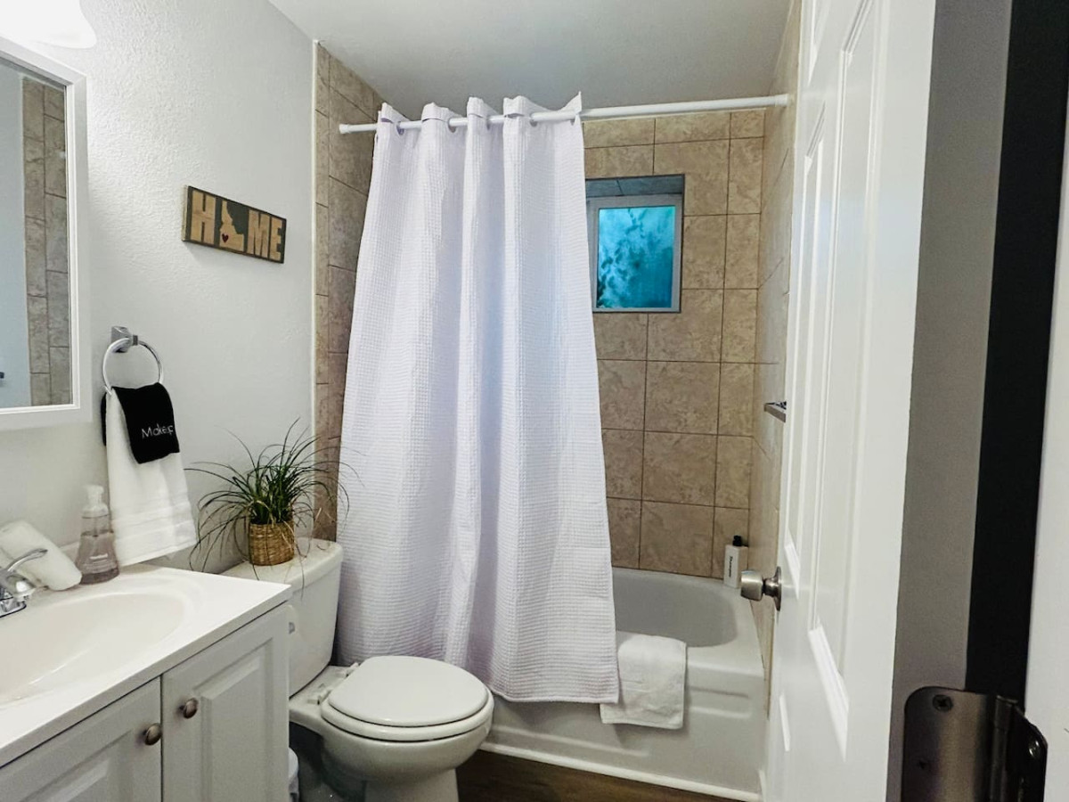 The newly renovated kitchen features stainless steel appliances, clean white cabinetry, and a full stock of essentials, so you’ll have everything you need to cook up a hearty meal or enjoy a cup of coffee in the morning. The bathroom is fully equipped with soaps, a hair dryer, and fluffy towels to ensure your stay is comfortable and worry-free.